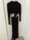 The NWT Ieena for Mac Duggal 27426 High Slit Black Cutout Dress is a stunning gown perfect for various occasions such as travel, weddings, parties, or even formal events. This long dress with long sleeves features a solid black color with a fit and flare style and a midi length, making it both elegant and versatile. The intricate cutout detail adds a touch of sophistication to this gown, which is ideal for those looking for a sexy and stylish outfit for special occasions.