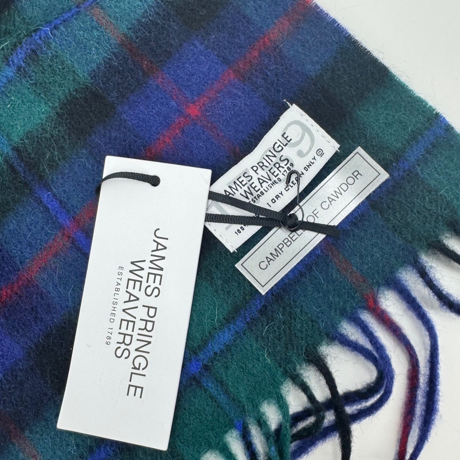 New With Tags classic tartan plaid scarf crafted by James Pringle Weavers. This accessory showcases the iconic Campbell of Cawdor tartan pattern in deep blues greens and subtle red accents. Fringed edges add a traditional touch to this luxurious wool scarf. Perfect for adding a touch of heritage to your everyday wear or for completing a sophisticated ensemble. Department: Unisex Style: Scarf Material: Wool Pattern: Plaid Type: Scarf Season: Winter Accents: Fringe Country of Origin: China Keywords: tartan, plaid, wool, fringed, heritage, classic, luxury, winter, warm, accessory, Scottish, traditional Approx 74" length 10" width. THANK YOU FOR VIEWING MY LISTING! Items are sold "AS IS". Please read all details in listing and review photos. Ask questions BEFORE purchasing. Photos are of actual items. Shipping services cannot be guaranteed. Shipments will ONLY be made to the verified address on file. Follow me and come back!