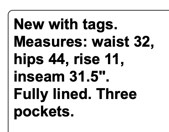 New with tags. Measures: waist 32, hips 44, rise 11, inseam 31.5". Fully lined. Three pockets. THANK YOU EBAY!!! We are so thankful for our customers! We have thousands of listings, and therefore receive hundreds of messages, every single day. So, if you are asking about a price drop, or a shipping price drop, or asking for extra measurements, or to add additional photos, please allow me to answer you here, No thanks. If your question is not one of those questions, we will be happy to answer you individually. YES...WE DO COMBINE DOMESTIC SHIPPING. Extra jewelry items ship for $2 each (except for large jewelry lots). We will refund the difference as we are mailing out.....we hope you enjoy shopping with us! We encourage you to read the description and check all photos.