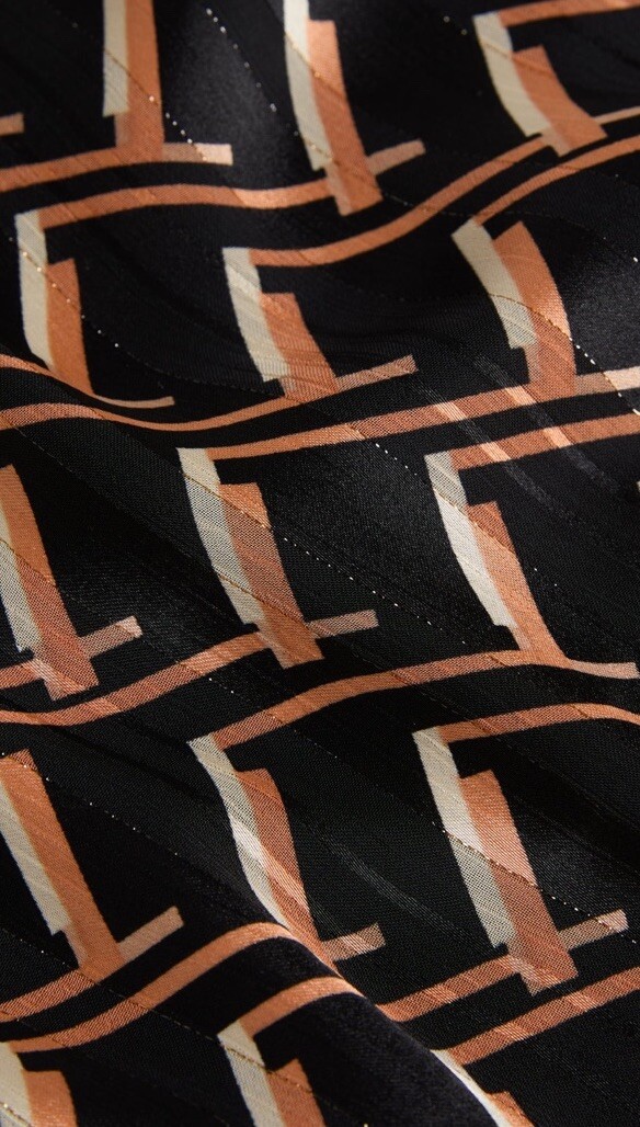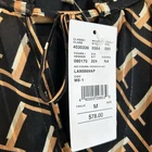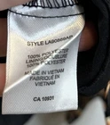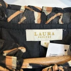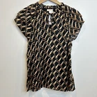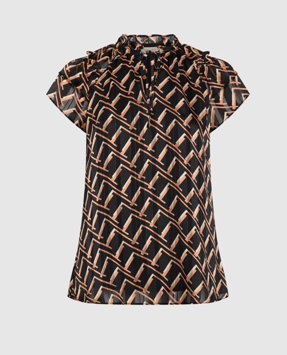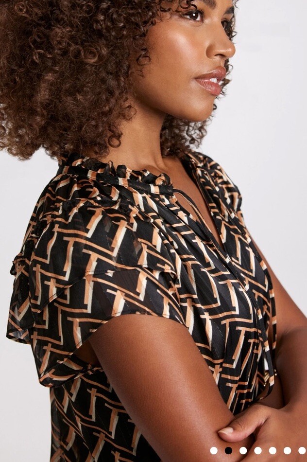 Laura Geometric Print Short Sleeve Blouse Black Pattern •size medium petite Our geometric print chiffon blouse is the perfect style to pair with slim-leg jean fitted pants for a perfectly contrasting look. Frilled split v-neck with ties Short tiered sleeve Geometric print; shadow stripe motif Lightweight chiffon fabric Materials: 100% Polyester