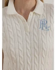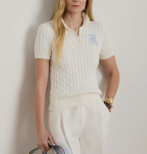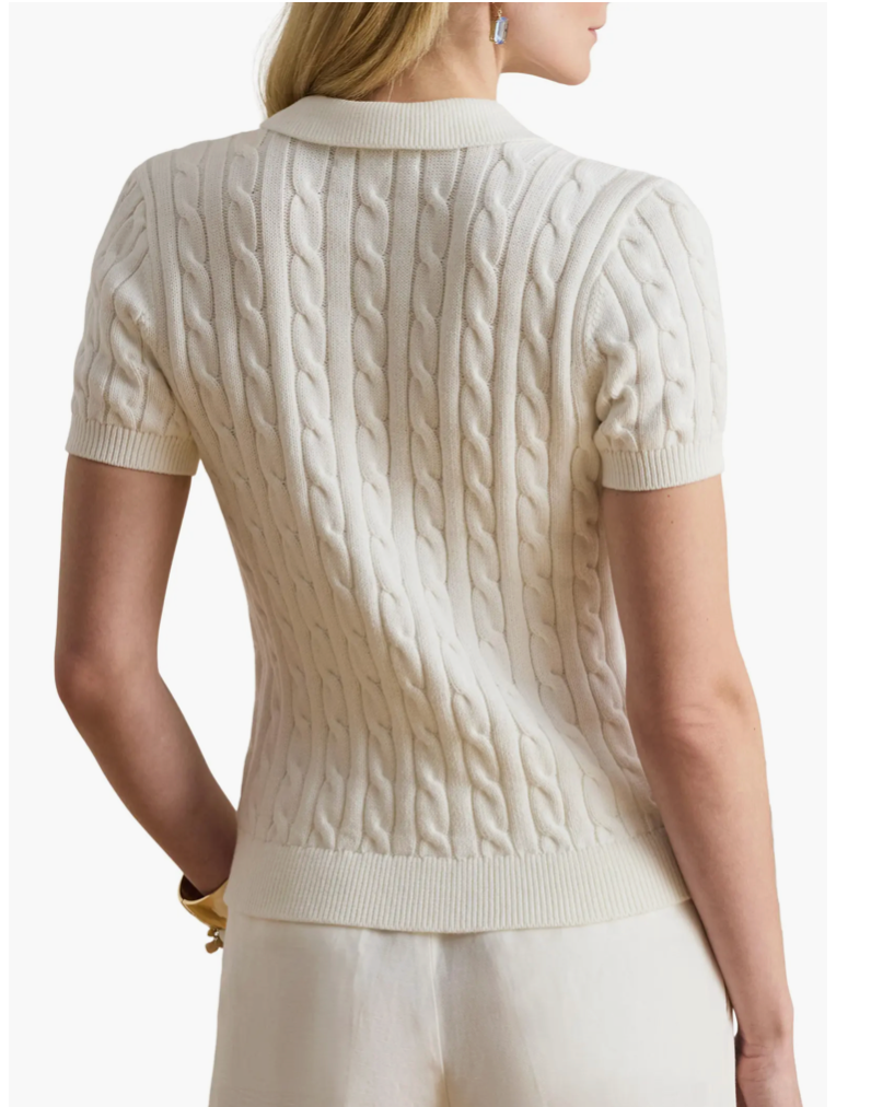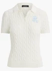Crafted with combed cotton for a soft hand, this piece unites a timeless Polo shirt silhouette with the comfort of a cable-knit sweater. It’s accented by Lauren’s signature embroidered logo and “LRL”-engraved buttons. Slim fit. Intended to hit at the hip. Size medium has a 21.75" body length. Body length is taken from the high point of the shoulder. Ribbed Polo collar. Three-button placket. Buttons custom-developed with an “LRL” logo. Short sleeves with ribbed cuffs. “LRL”-embroidered logo at the left chest. Ribbed hem. 100% cotton. Machine washable or dry clean.