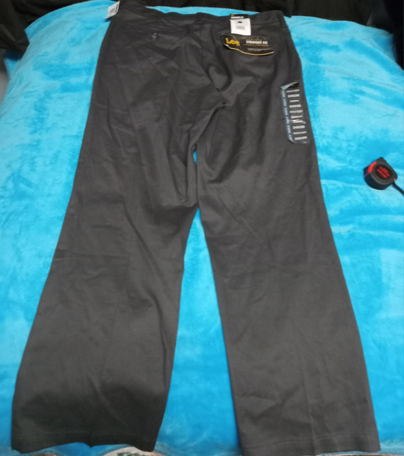 This is a Lee Total Freedom black flat front relaxed fit pant in size 34 x 30. It features a solid pattern, zip closure, and is made of a cotton blend material with a canvas fabric type. The pant is suitable for business occasions and has a straight leg style. The brand is Lee and it is a regular size type for men. The waist size is 34 inches and the inseam is 30 inches.