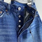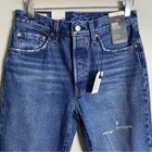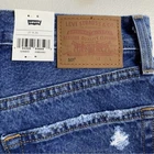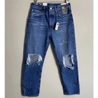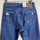 Iconic 501 straight-leg jeans cut from classic nonstretch denim feature distressed accenting and stringy, gaping holes at the knees for an edgy touch. Medium wash. Light fading and whiskering. Subtle splatter bleaching at hems. Intentionally distressed with destroyed knees. High rise. Button fly closure. 5-pocket style. Belt loops. Straight, cropped leg. Signature logo patch at back waist. Rigid, no-stretch cotton denim construction. Color Wash: Athens Ranks Size 27 = 4 Measures Flat Approximately: 14" Waist, 19.25" Hips, 11" Rise, 25.5" Inseam 100% Cotton Machine Washable **BRAND NEW! WITH TAGS!**