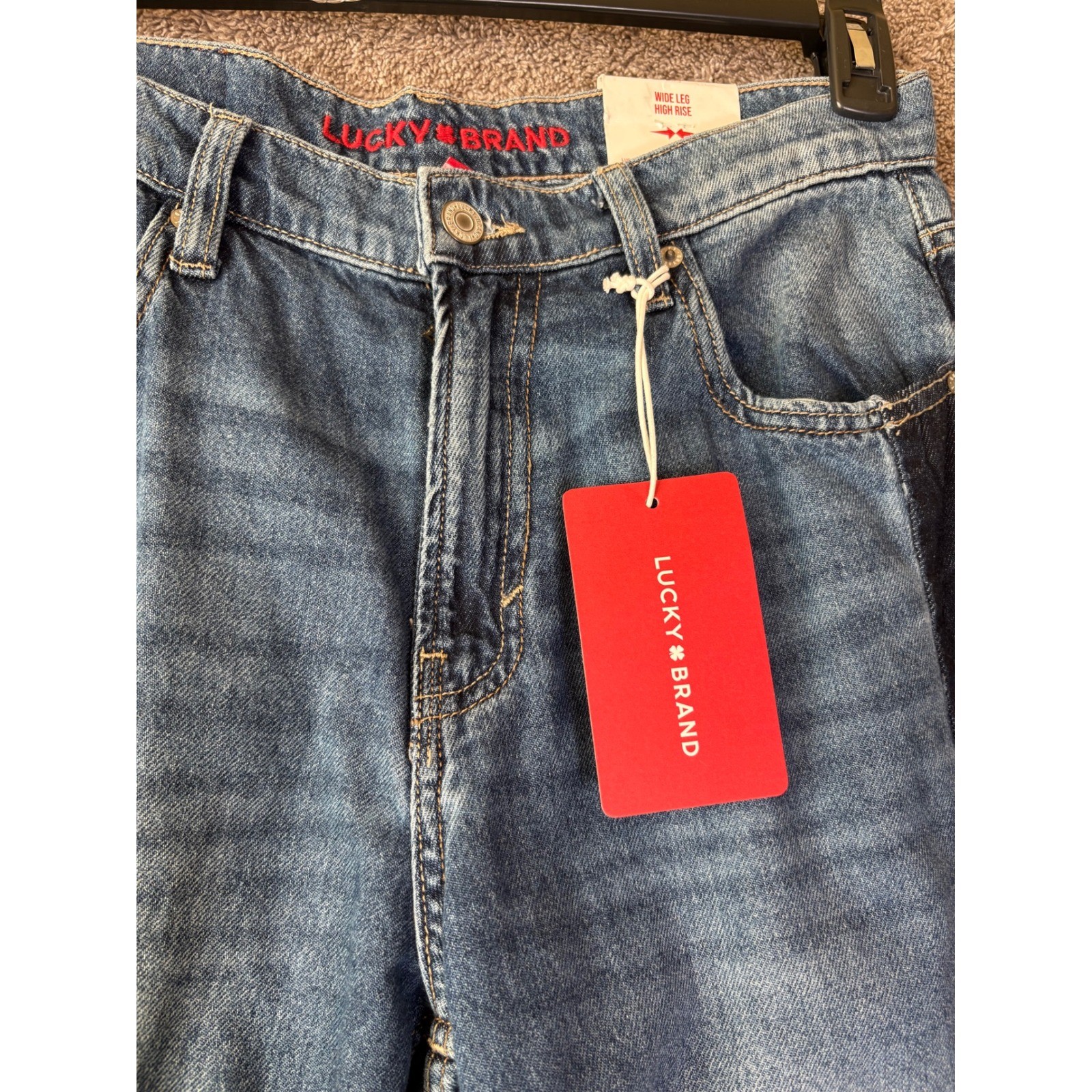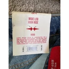 Lucky Brand wide leg high rise rigid denim jeans in a blue wash. These jeans feature a unique two-tone denim design with a darker wash panel along the outer seam of each leg and a frayed hem. Perfect for a casual day out or a relaxed weekend. Measurements: • Inseam: 32 in • Waist: 28 in Style: Wide-Leg Department: Women Fabric Wash: Medium Waist Size: 28 in Type: Jeans Accents: Logo, Fringe Features: Distressed, Pockets, Wrinkle Resistant Fit: Relaxed Pattern: Solid Rise: High (Greater than 10.5 in) Fabric Type: Denim Inseam: 32 in Material: Cotton Blend Closure: Button Keywords: Lucky Brand, women's jeans, wide leg, high rise, rigid denim, two tone, frayed hem, blue jeans, distressed, casual, weekend wear, fashion denim, new with tags