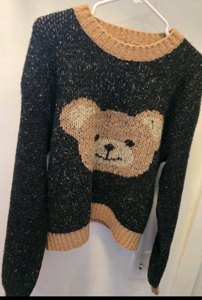 The Luna Ivy black brown teddy bear long sleeve pullover sweater in size medium is a stylish and comfortable addition to any woman's wardrobe. The sweater features a cute teddy bear design, with a medium size that is perfect for a regular fit. The long sleeves make it ideal for cooler weather, while the pullover style offers easy wear and versatility. The brown color adds a touch of warmth and sophistication to the overall look, making it a great option for a casual yet chic outfit.