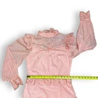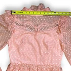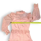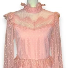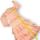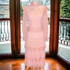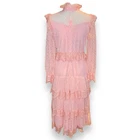 NWT Luzia Fazzolli Womens Dress - Coquette Tule Chantilly Lace Pastel Peach Maxi Channel Classic elegance and romance in this stunning dress from Luzia Fazzolli. Made of delicate tule and chantilly lace, it features a midi to maxi length depending on height, tiered long sleeve dress in Euro size 38/US 6-8. Please see photos for measurements. For reference, this dress fit my size 6 mannequin perfectly. Perfect for formal events, weddings, or special occasions. Features: High lace collar with button closure behind the neck Back Zipper for easy dressing Beautiful sheer lace sleeves Buttoned cuffs with flutter lace detail Flutter lace detail at shoulder and waistline Tiered lace overlayed skirt Slip lined 100% Polyester Made in Brazil New With Tags Note: There is some ink transfer on the inner slip of the dress where the care tag must have made contact. It does not show on the outside of the dress and very well may wash off upon laundering. B5