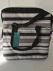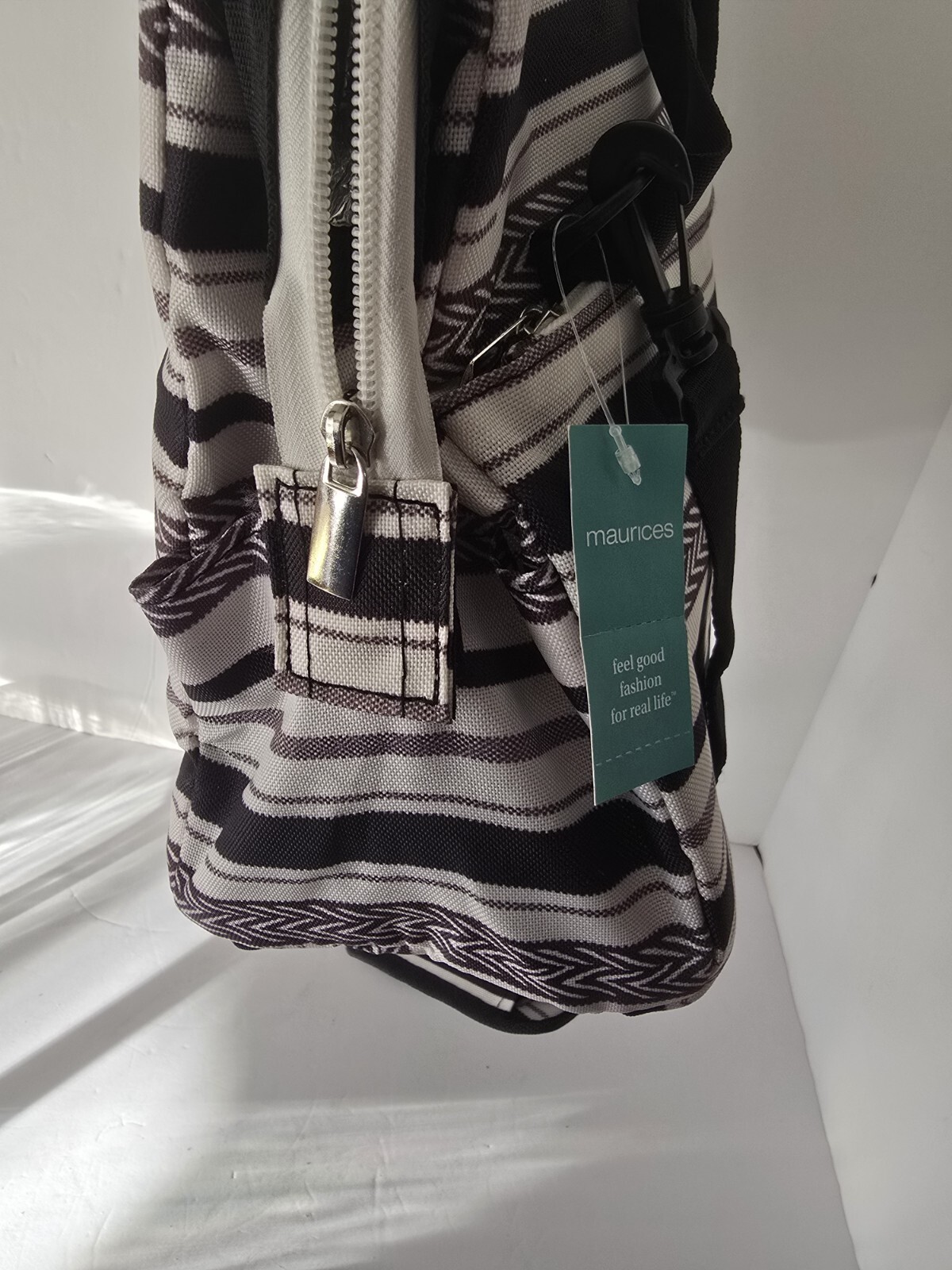 This Maurices lunch tote is a perfect addition to your casual lunch routine. With its black and white striped pattern, rectangular shape, and zip closure, it's both stylish and practical. The tote is made of a cotton blend exterior material and has a silver lining color. The bag measures 9 inches in width and 11 inches in height, making it a large tote that can fit all your lunch essentials. It also features outer pockets for added convenience. The handle/strap is made of bkack nylon material, and the hardware color is silver. This tote is perfect for any woman who wants to add a touch of style to her lunch routine.