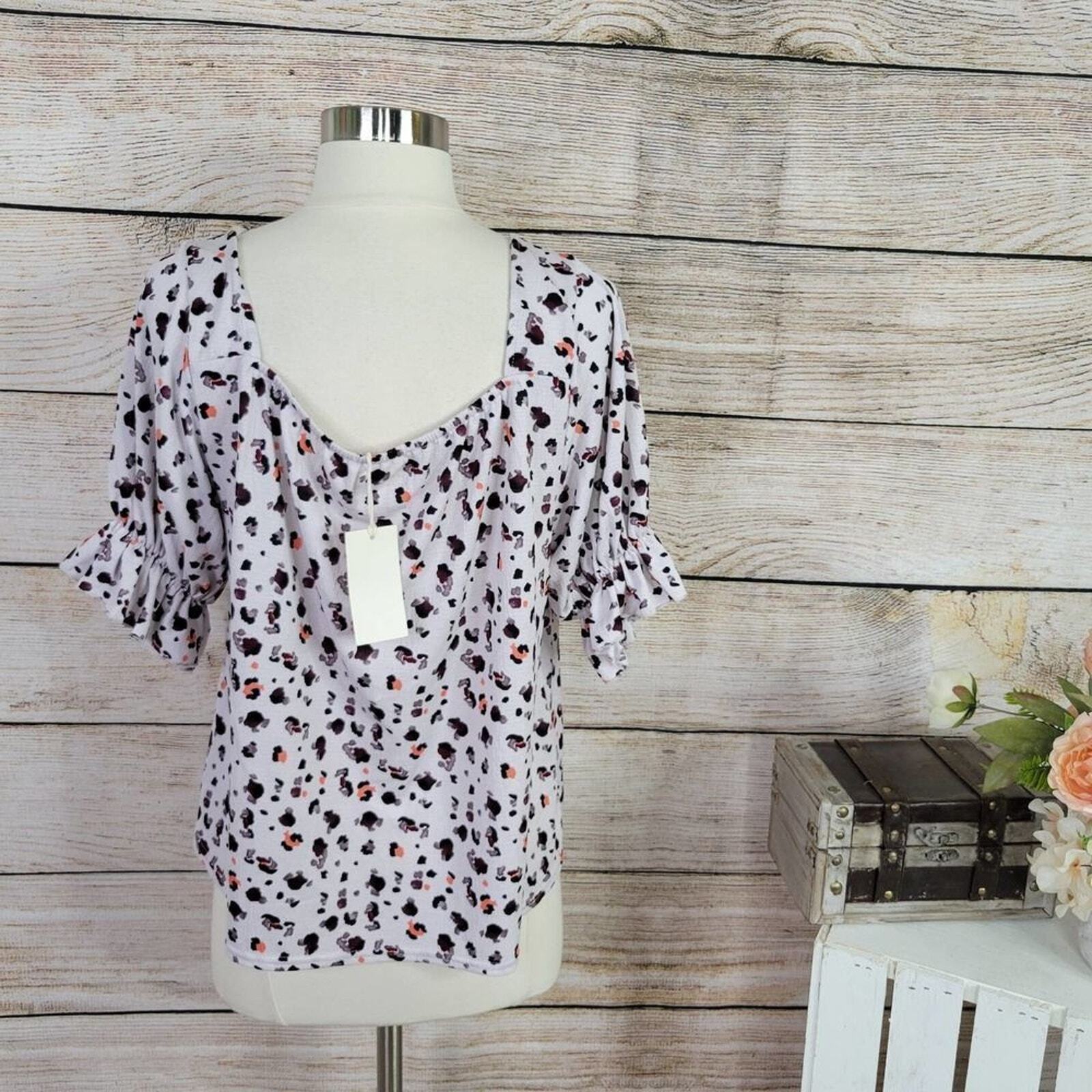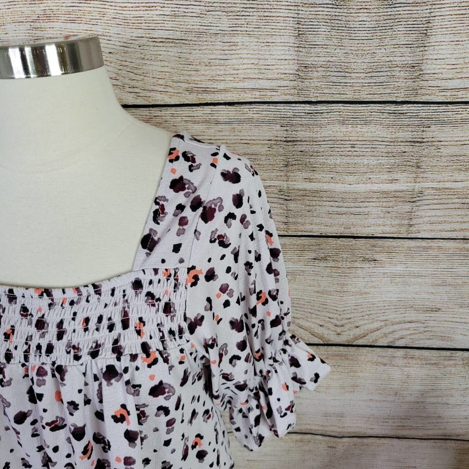 New With Tags! NWT Melloday Smocked Animal Print Short Sleeve Blouse Size Small. Super cute short sleeve smocked peasant neckline top. Shart sleeves with elasticized hem. Cream with black and orange leopard pattern. Brand New Condition. 97% Polyester, 3% Spandex Approximate Measurements Armpit 21" flat Bust 21" flat Length 22"