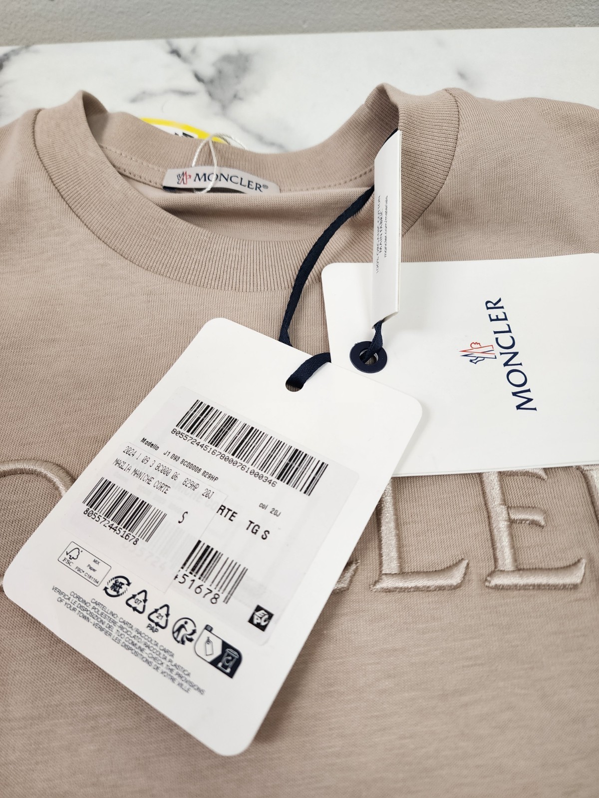 This product is a brand new Moncler women's t-shirt in a size small. Made from 100% cotton, this beige t-shirt is crafted in Türkiye. With its original price of $390, this high-quality piece is perfect for any fashion-forward woman looking to add a touch of luxury to her wardrobe.