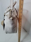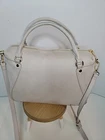 This Nanette Lepore Clarissia satchel crossbody bag features a solid design with a zip closure. The exterior is made of faux suede/leather and denim in a pearl color. It has ivory handles/straps, gold hardware, and studded accents. The bag is medium-sized with a brushed finish, making it a stylish choice for women looking for a versatile and fashionable accessory. MSRP $118 PLEASE SEE PHOTOS FOR TWO SLIGHT IMPERFECTIONS