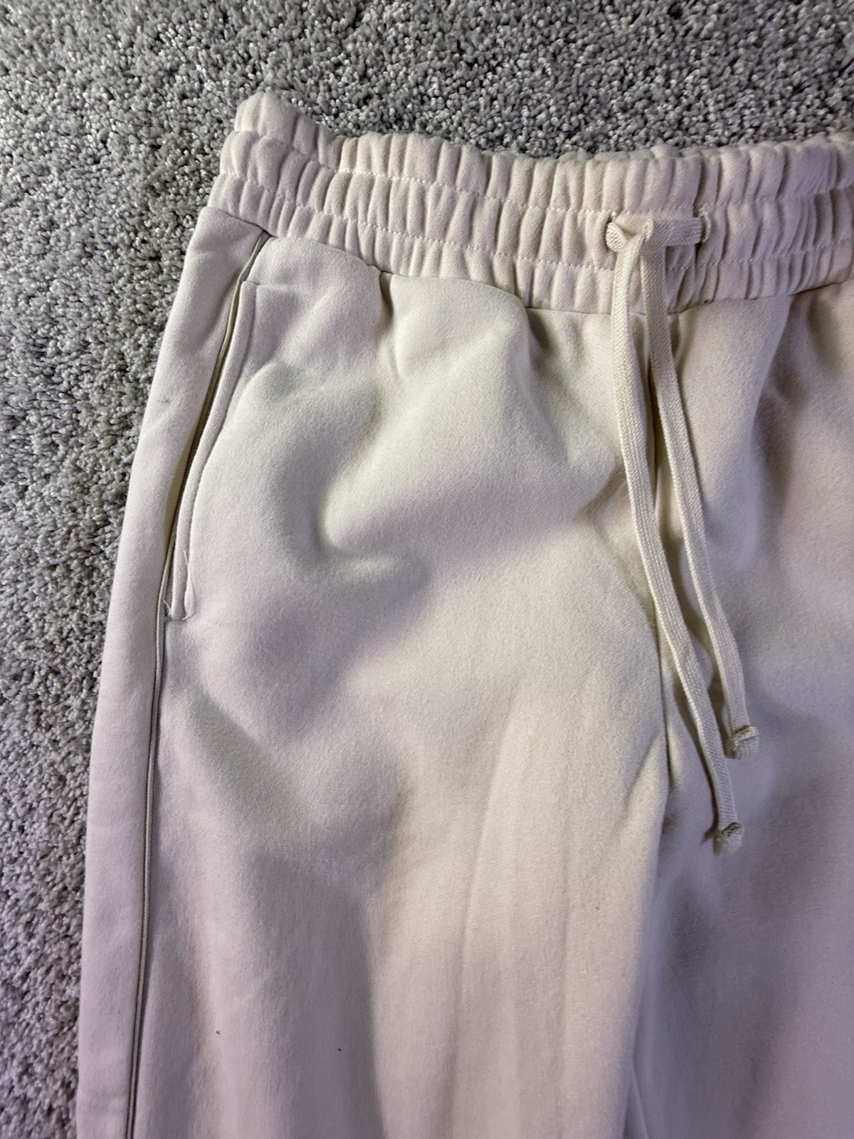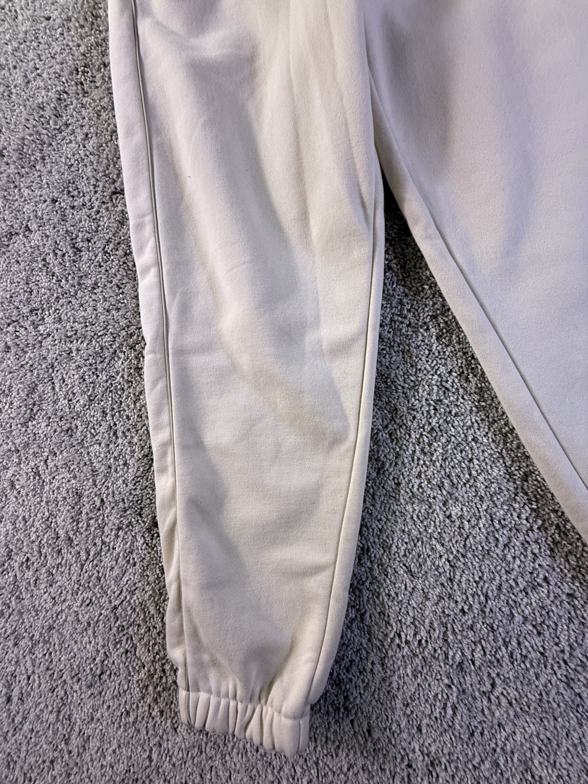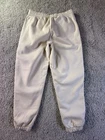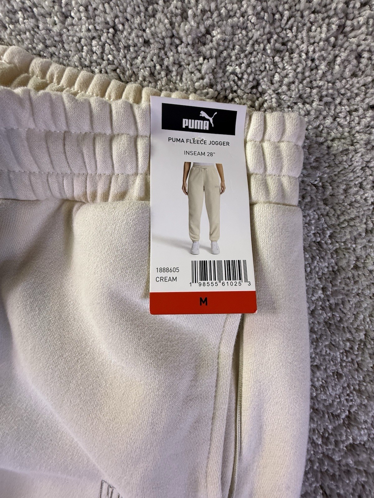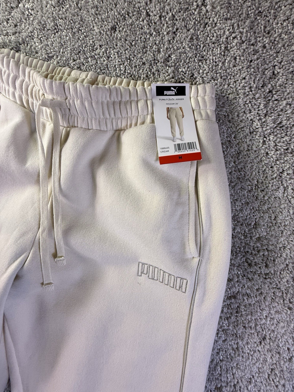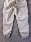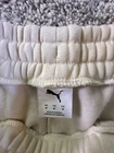 The NWT PUMA Women's Fleece Jogger in size Medium and ivory color is a stylish and comfortable pair of activewear pants suitable for various activities such as gym training, cross training, and running. Made from polyester fleece fabric, these joggers feature a tapered leg style and drawstring closure for a customizable fit. With drawstring side pockets for convenience, these sweatpants are machine washable for easy care and are perfect for active women looking for a cozy yet fashionable bottoms for their workout routines. 4603