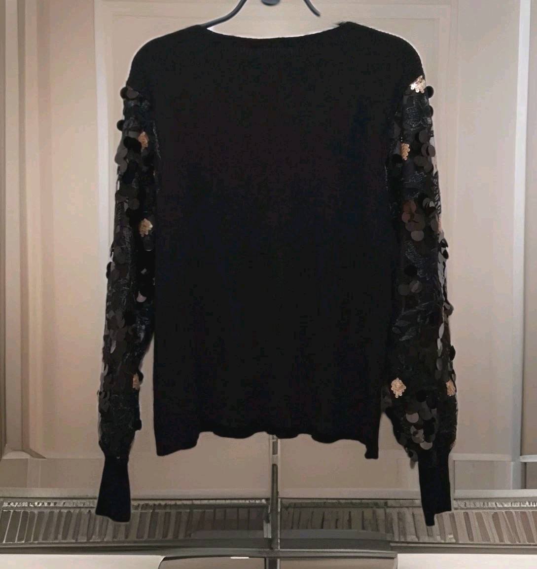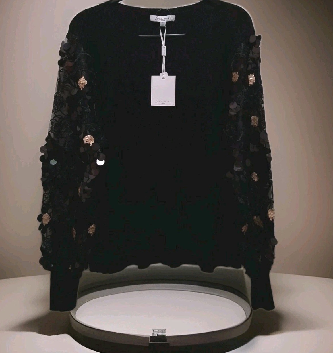 The stunning New With Tags Sioni Milano Ribbed Sweater is a stylish and elegant choice for women, featuring sheer sequin embroidered sleeves that add a touch of glamour. This black sweater with gold accents is perfect for various occasions such as parties, casual outings, and business events. Perfect for Christmas or New Years Eve! Made from a blend of polyester, nylon, and rayon, this tight-knit sweater has a round neckline, long balloon sleeves, and a regular fit. Hand wash only to maintain its quality. This sweater is a must-have for the winter, fall, and spring seasons for sny occasion you want to Sparkle and make s statement. It is a versatile and eye-catching addition to any wardrobe. Brand new with tags!