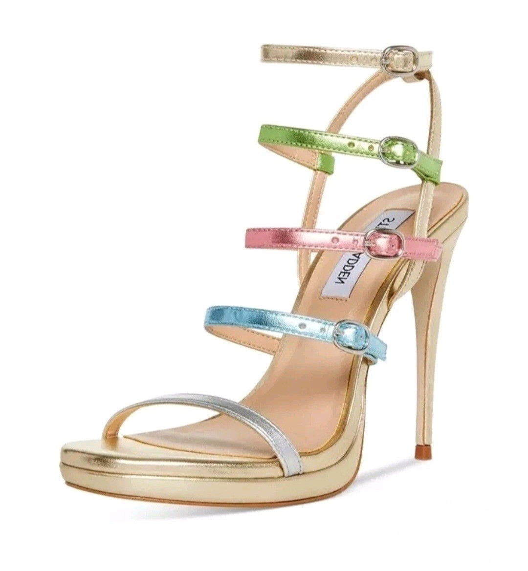 The Steve Madden Jubilat Metallic Multi Strap Fashion Heels are stylish shoes in a multicolor metallic design. They feature multiple straps and are designed with a high heel, creating a fashionable look perfect for any woman. Available in UK and US shoe sizes 9.5, these heels are a trendy choice for those looking to add a touch of glamour to their outfit.