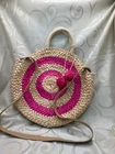This is a medium-sized round beach bag made of corn husk and straw, featuring pink pom pom tassels and a beige fabric lining. It has a snap closure, and a beige faux leather shoulder strap and a hemp round handle. The brand is Trendedit, and it includes a bag charm. The bag has a height of 13 1/2 inches, a width of 3 inches, and a depth of 13 inches. Made in China.
