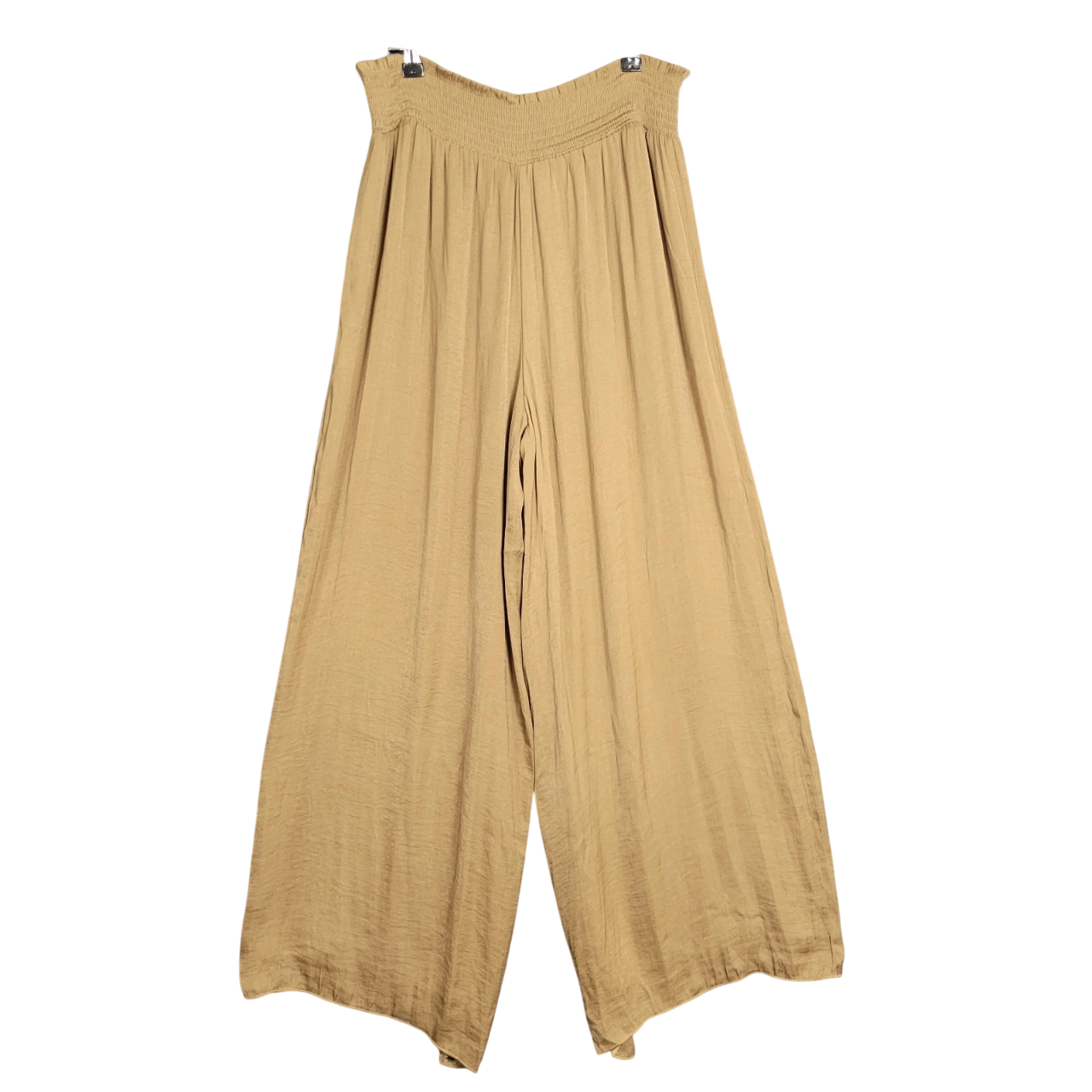 These pants are so comfortable and stylish! The smocked waist gives a perfect fit, and the wide-leg design flows beautifully. The rich brown color is versatile, and the quality feels luxurious. They arrived in pristine condition—definitely a great addition to my wardrobe!
