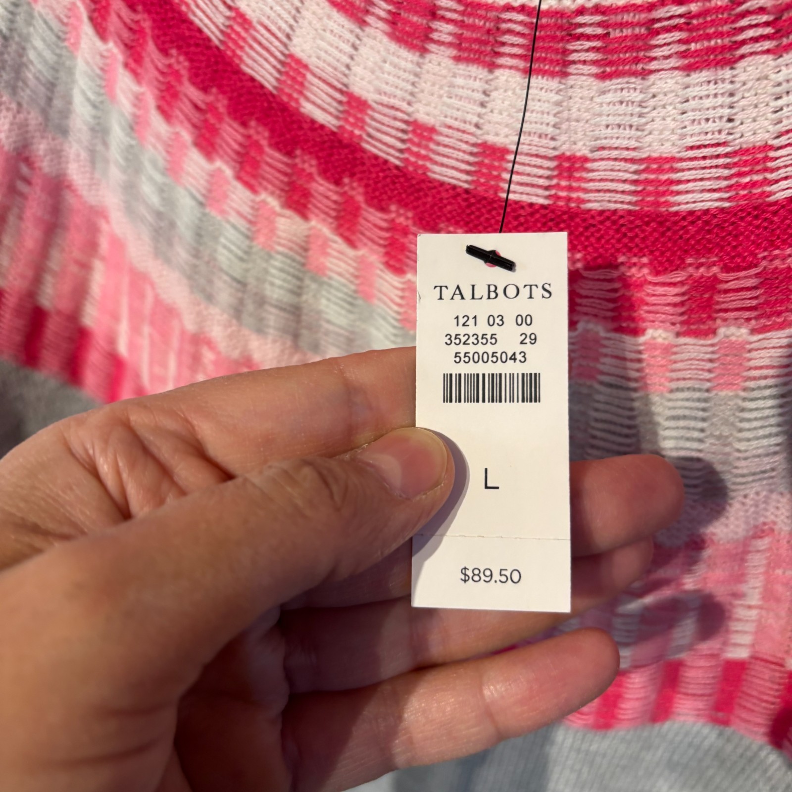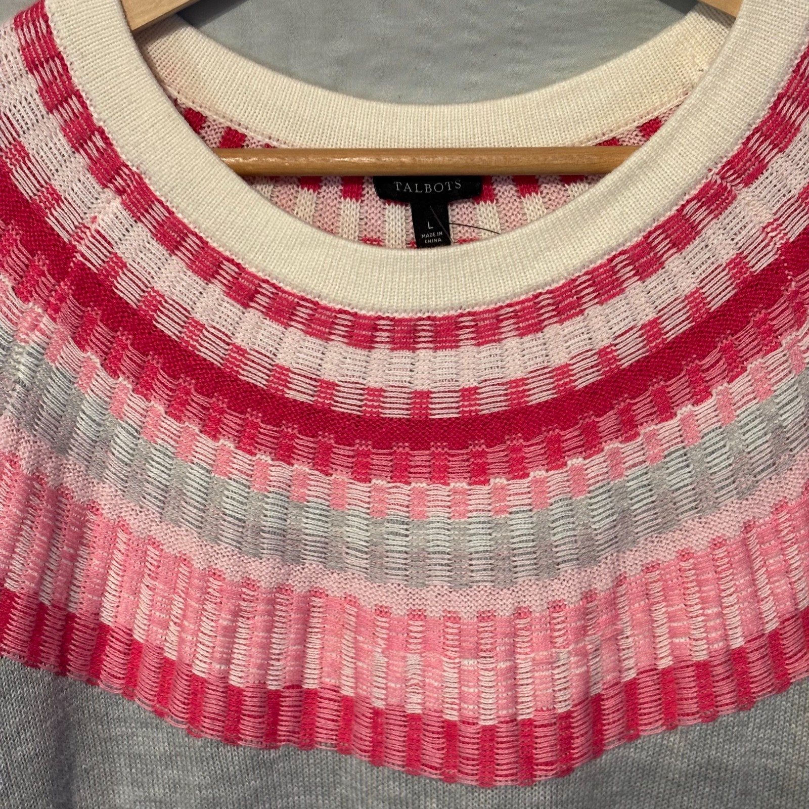 NWT Talbots women's cozy gray sweater features a pink and cream circular design, making it a stylish addition to your winter wardrobe. Crafted from a blend of polyester, nylon, and cotton, this sweater is machine washable for easy care. The regular fit and long sleeves make it perfect for casual occasions, with a classic crew neck and pullover style that is both comfortable and versatile.