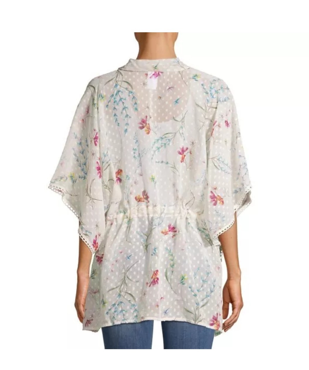 Time & Tru dotted white and floral textured kimono top with tie in front. Women's size L-XL. New with tags. Never worn. 100% Polyester Machine wash _______________________________ * Questions are always welcomed * Smoke-free, pet friendly home * Items are shipped fast, next day. Bundle discount on shipping. * Sizes differ from brand to brand. If measurements have been provided, please compare these to a garment you already own that fits you well. * eBay return guarantee if item is ** not as described **. For all other returns, shipping is non-refundable and return shipping cost is the buyer's responsibility. * Your satisfaction is important to us! Please let us know if you are not 100% satisfied with your purchase so that we can try to make it right.