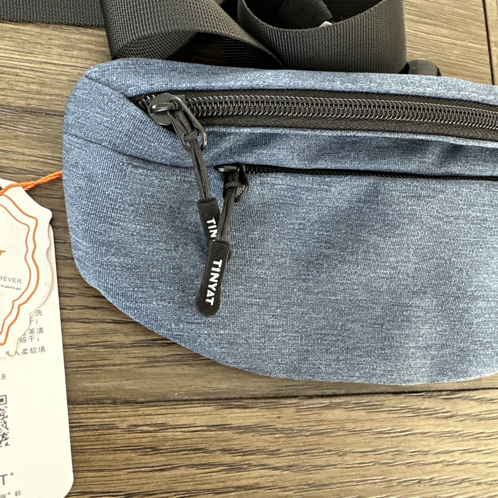 This Tinyat fanny pack waist bag is perfect for those who want a hands-free option while on-the-go. The exterior is made of durable polyethylene in a beautiful astral blue color, while the interior lining is a stylish gray linen material. The bag features a zip closure and an adjustable black strap that makes it perfect for both men and women. The bag is small in size, with three zipper compartments, making it perfect for carrying just the essentials. It has a lined interior and is lightweight, ensuring that it won't weigh you down. The hardware is also black in color, adding a sleek touch to the design. This belt bag and fanny pack is perfect for anyone who wants a convenient and stylish option for their daily outings.I’m