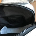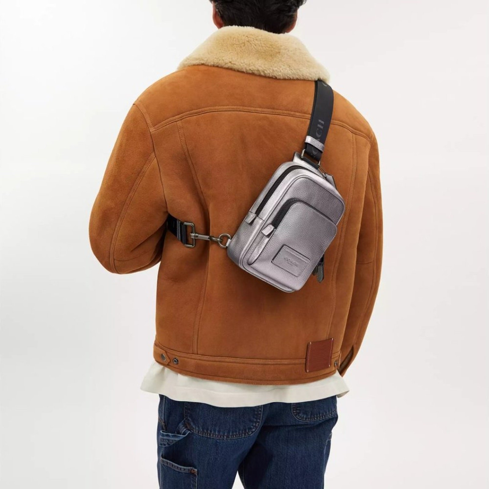 Black Antique Nickel/Metallic Ash Foil metallic refined pebble leather Zip closure, fabric lining Outside zip pocket Adjustable shoulder strap with 49" length for crossbody wear 5 1/4" (L) x 7 3/4" (H) x 2" (W) Style No. CP141