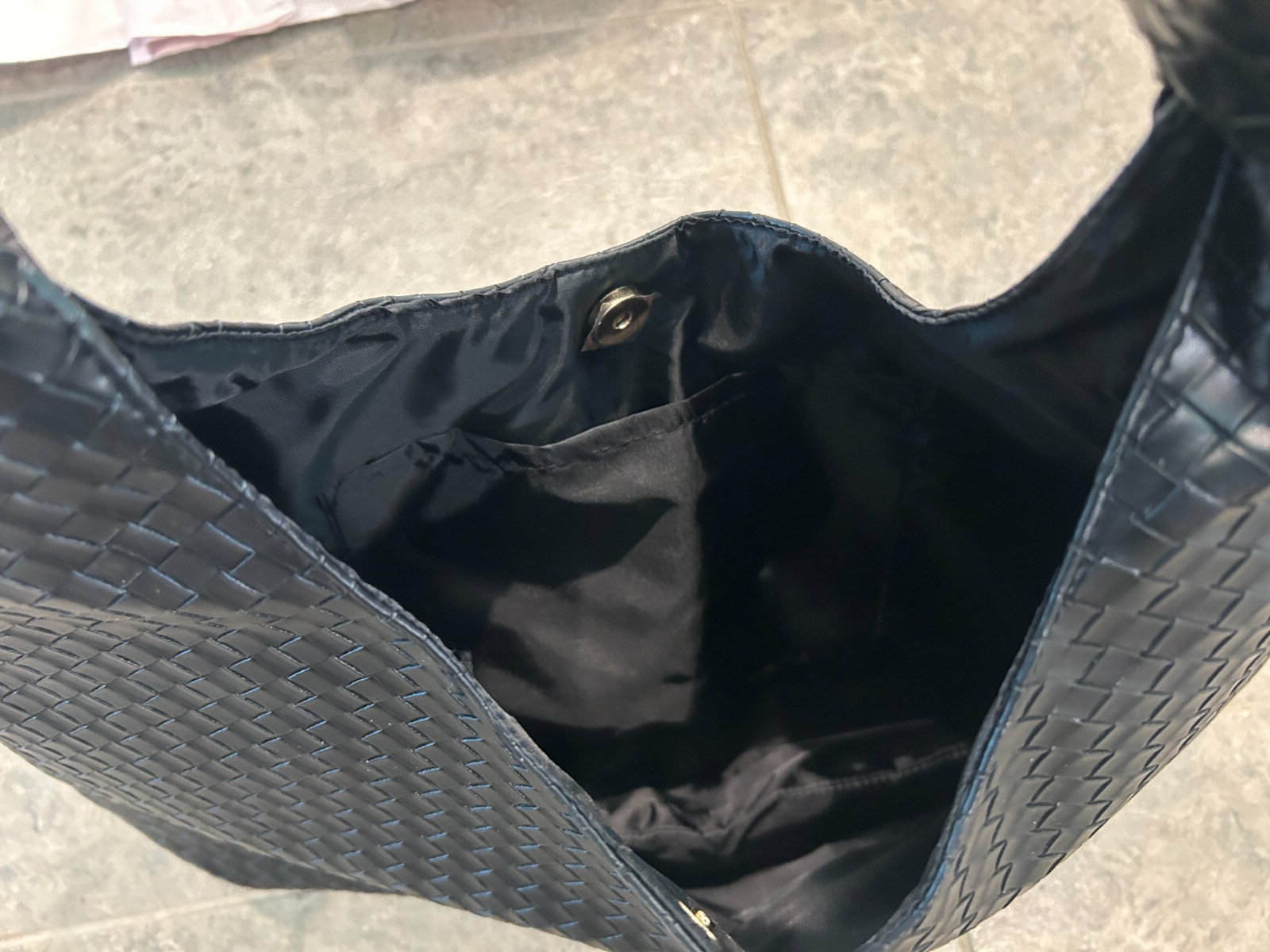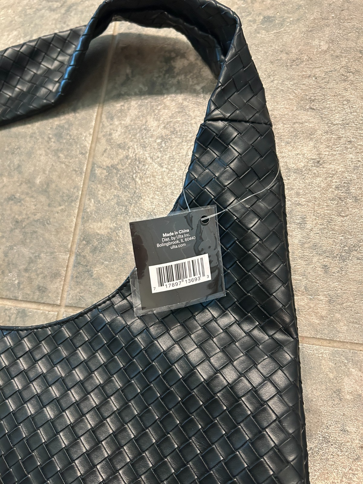 Large black tote bag/shoulder purse from Ulta Beauty, faux leather, width just over 16", height from bag opening to bottom 10", Has 4" bottom width front to back. One button closure in middle. Inside nylon lining, has one interior pocket. Please ask any questions you have and thank you for looking.
