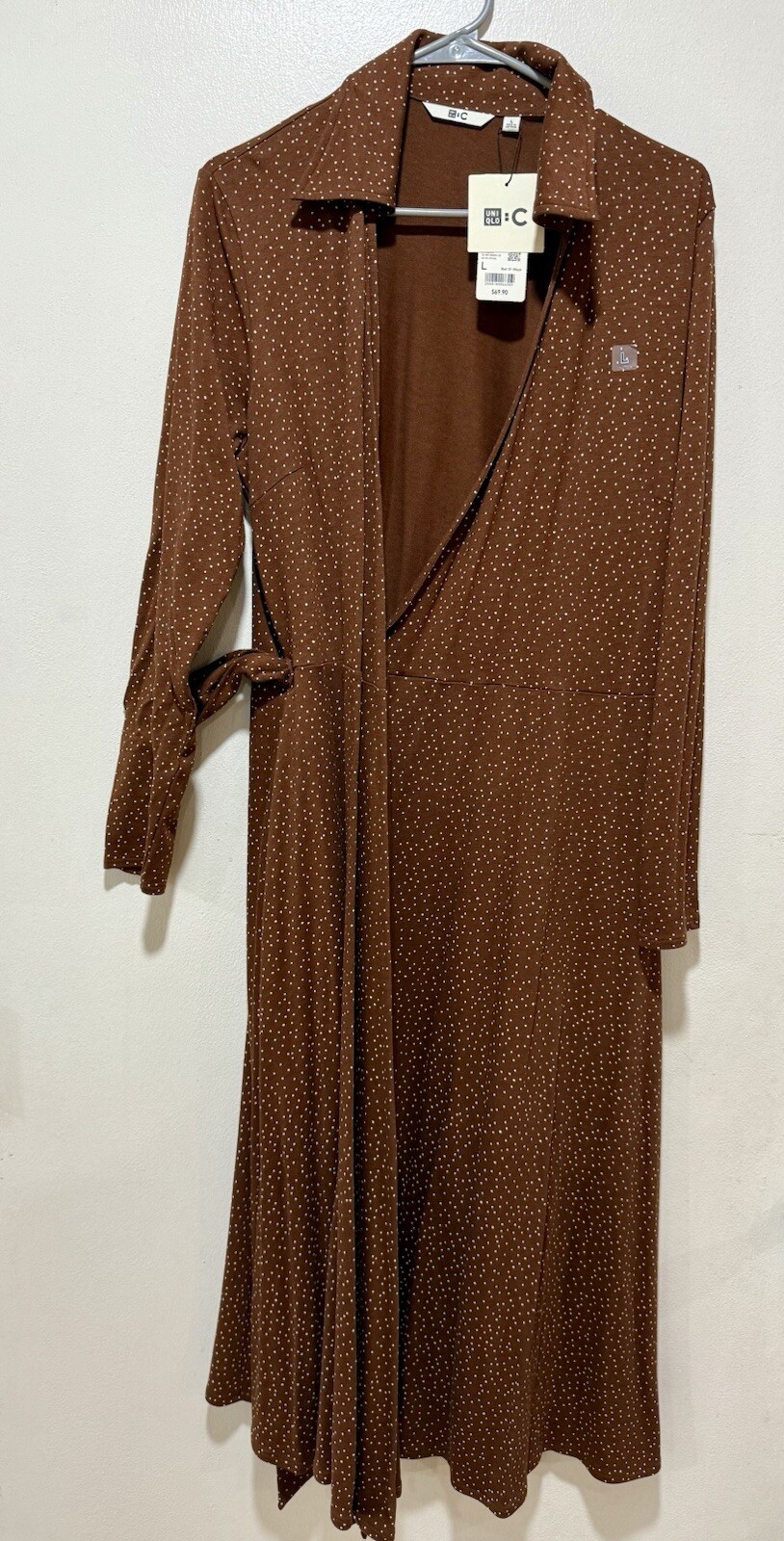 This NWT Uniqlo C Wrap Long Sleeve Dress in size L is a stylish and casual option for women. The dress features a solid brown color with pleated accents, a long sleeve design, and a wrap style, making it suitable for both fall and spring seasons. With a long dress length, this piece offers a classic and versatile addition to any wardrobe, perfect for everyday wear. The brand Uniqlo is known for its quality and trendy apparel, making this dress a reliable and fashionable choice for various occasions.