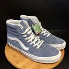 The product is a pair of NWT Vans Sk8-Hi blue suede high top sneakers in men's size 11.5. These lace-up sneakers feature a cushioned and comfortable design, making them suitable for activities like walking, school, and skateboarding. The classic Vans style with a colorful theme and the signature Vans character make these sneakers a stylish choice for casual or activewear during all seasons. The outsole is made of rubber for durability, and the lining material is suede for a premium feel.