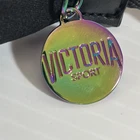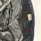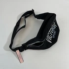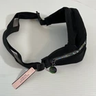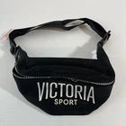 This is a small black fanny pack belt bag from Victoria's Secret with a silver iridescent zipper and black waist/crossbody strap. The exterior is made of polyurethane and features a logo pattern and zipper accents. It comes with a pouch and bag charm and has a black lining. It is lightweight and has an adjustable strap.All clothing/fabric items have been cleaned per eBay policy standards/manufacturer's standards.