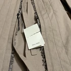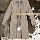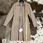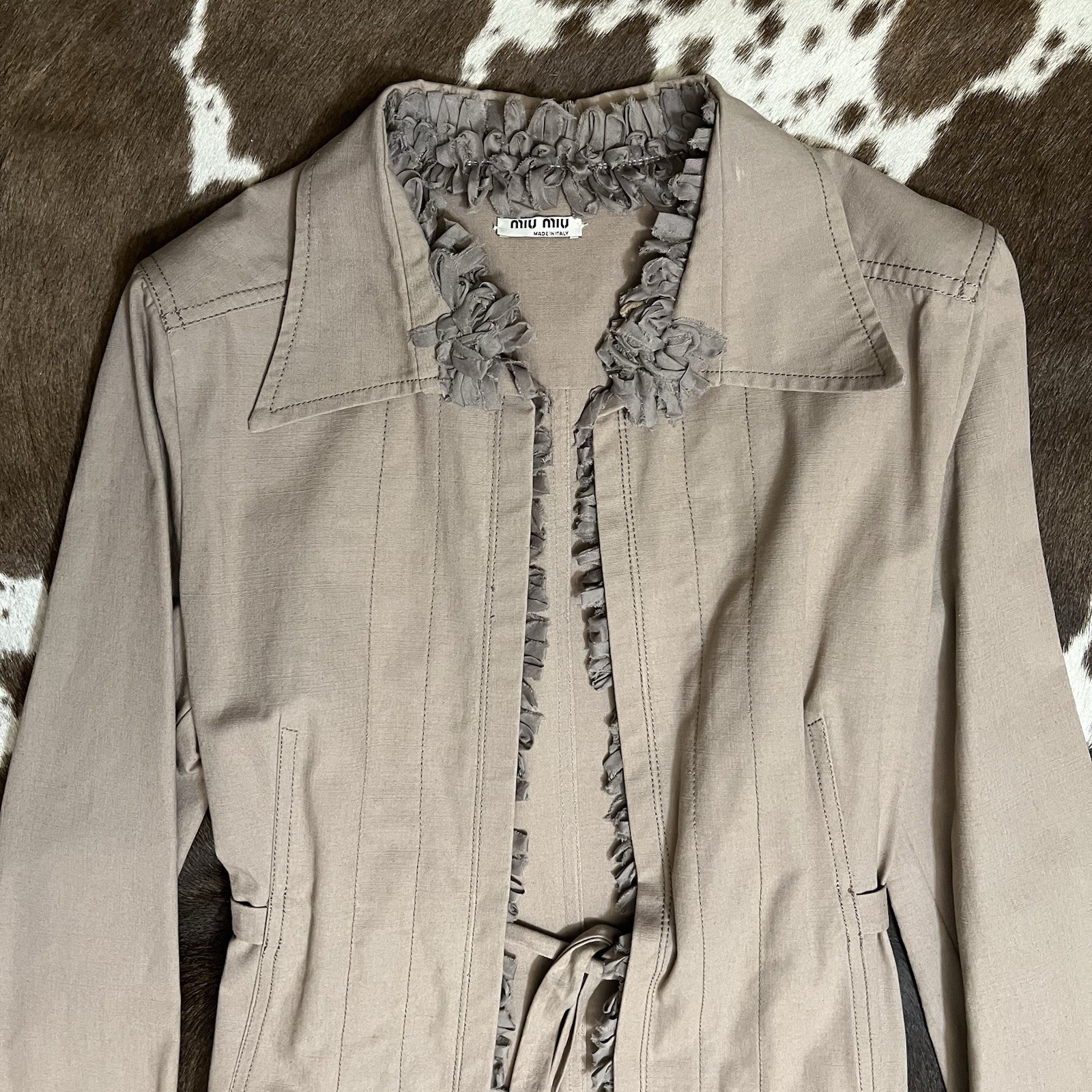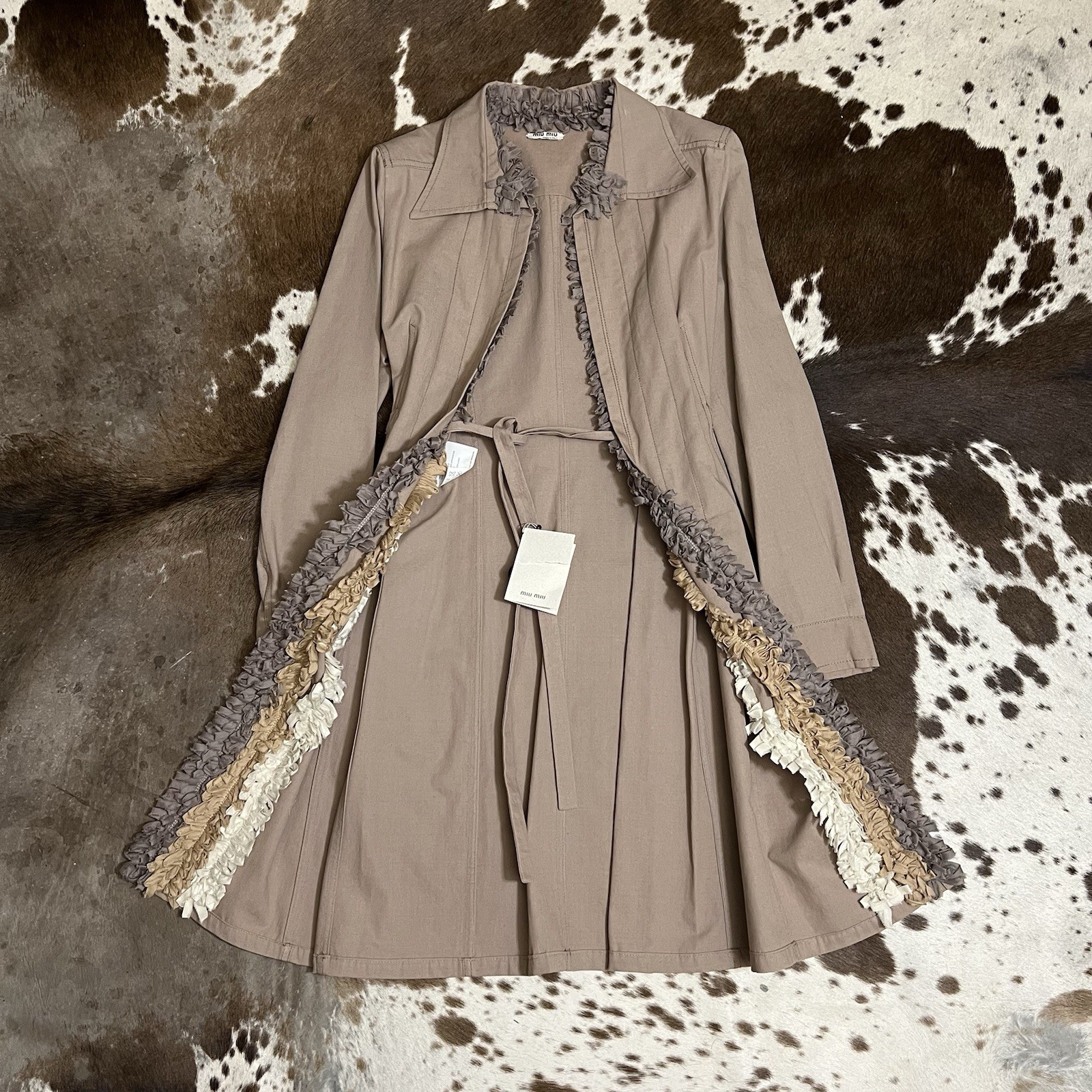 The NWT Miu Miu Tan Ruffle Trench Coat in size 44 is a stylish and versatile outerwear piece perfect for various occasions. Made from cotton with a solid brown color, this long sleeve coat features a drawstring closure, ruffle accents, and a belted fit. The classic trench coat style with a collared neck, lightweight design, and pockets make it suitable for all seasons and can be worn for casual, formal, or party settings. Designed by Miu Miu, this coat exudes a designer feel with a touch of vintage flair, making it a timeless addition to any wardrobe.