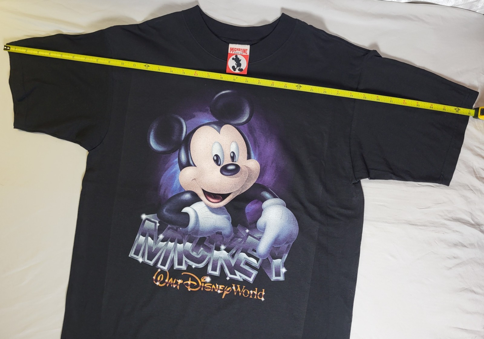 This NWT Vintage Walt Disney World Mickey Mouse T-Shirt in black, size large, is a classic piece from the 90s era. Made of cotton with a graphic print featuring Tigger from Disney characters, this shirt has a crew neck and short sleeves for a comfortable fit. The vintage boxy style adds a nostalgic touch, perfect for fans of Disneyland and Disney characters. Additionally, the shirt is made in the United States and showcases a single stitch collar, making it a timeless addition to any man's wardrobe. #0208