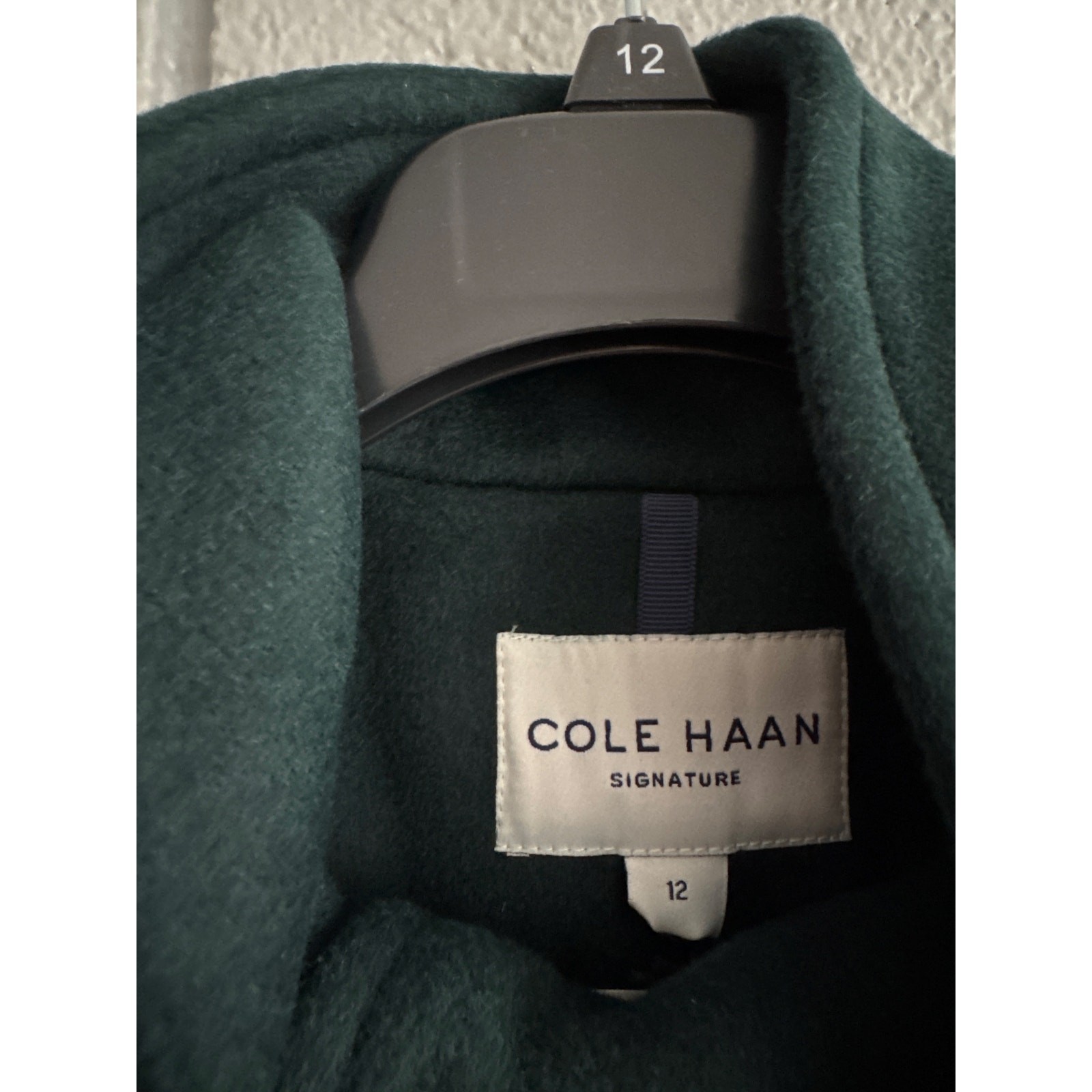 NWT Women's Cole Haan Stand Collar Wool Blend Coat in Emerald Green size 12 Cole Haan uses fine materials to form quality staples for your collection. Made of a rich wool blend, this tailored coat skims the figure with elegance and is finished with welt pockets at the waist. Stand collar Long sleeves Snap front Front welt pockets Back vent Materials: Wool/polyester/other fibers Measurements: pit to pit: 21.5” length: 35”