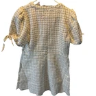 This New With Tags Women’s Medium Simply Southern Ivory & Gold Knit Scalloped Short Dress features a round neckline, short sleeves with puff sleeves accents including ties, and a pullover closure. Made of polyester knit fabric with a white and gold color, this A-line dress is perfect for various occasions like weddings, parties, and casual wear. The scalloped detailing, along with buttons, tweed, and zipper accents, adds a touch of elegance to the short dress. With features like lining, slimming fit, and pockets, this dress is stylish and versatile for all seasons. Preppy. CottageCore. Sorority parties. Homecoming. Twee. Royalty. Typically mail on purchase date.