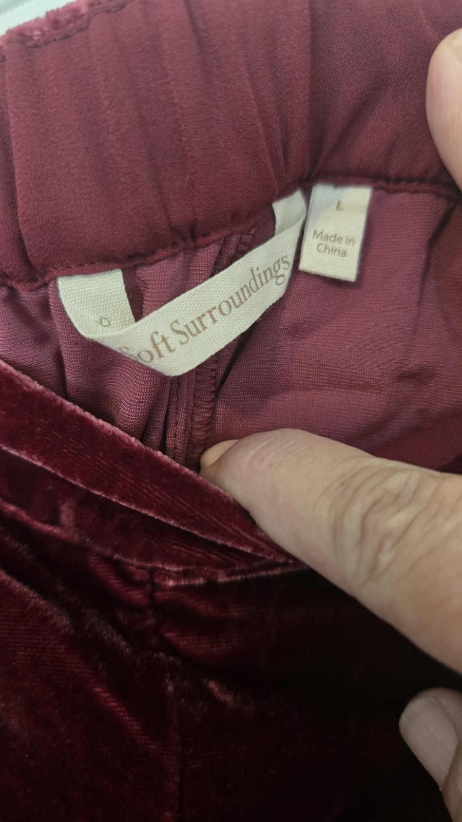 The NWT Large Soft Surroundings Pull On Velvet Pants are a luxurious and comfortable option for women looking for stylish bottoms. Made of polyester with a smooth velvet fabric, these wide-leg pants feature an elastic waist for added comfort and stretch. The dark rust color adds a touch of sophistication to the solid pattern, making them versatile for both casual and dressed-up occasions. With a pull-on closure and regular fit, these pants from Soft Surroundings are a flattering and easy-to-wear addition to any wardrobe.