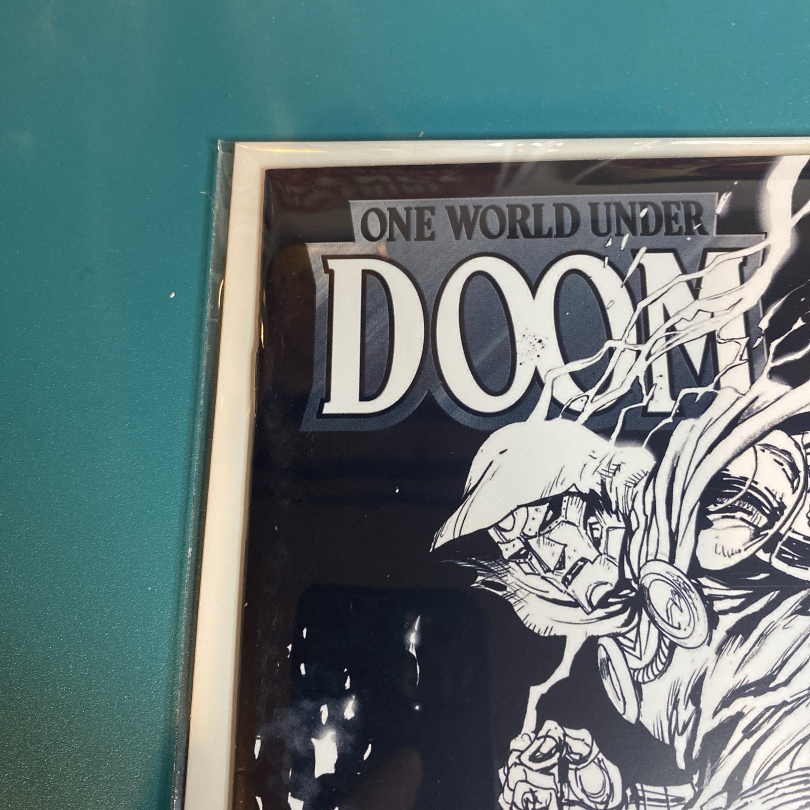 The product is a limited edition comic book titled "NYCC 2025 WHATNOT YEAR IN MARVEL 25 ONE WORLD UNDER DOOM #1 B/W LTD 100” This variant cover, retailer exclusive issue is part of the "One World Under Doom" series and has a print run of only 100 copies. With artwork by Tyler Kirkham, this single issue comic book is a special edition first character appearance that is sure to be a coveted collectible for fans of the Fantastic Four.