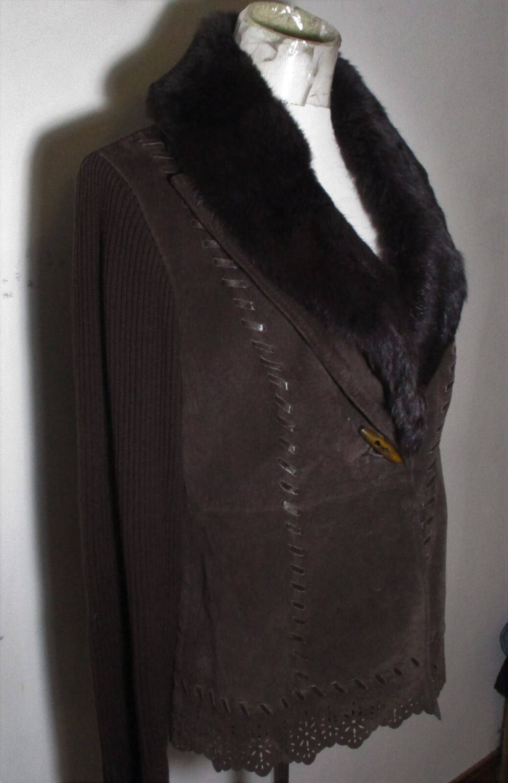 See my EBAY STORE at “SAMTPC53” to view 100’s more of my Women's Sweatshirts!!! ( Combine Shipping: (on multiple items you pay full price on heaviest item first and then HALF PRICE shipping on ALL other items. Women's Leather & Faux Fur Blend Jacket. Brand: NYGARD. Description: women's Leather and Knit NYGARD jacket with removable Faux Fur collar, barrel button and loop on front, see pics. Color: Brown. Size: M 10-12 (see measurements). Measurements: 19" armpit to armpit, 26" shoulder to hem, 20" insleeve. Material: 100% Leather and Knit. Condition: Excellent condition, NWOT.