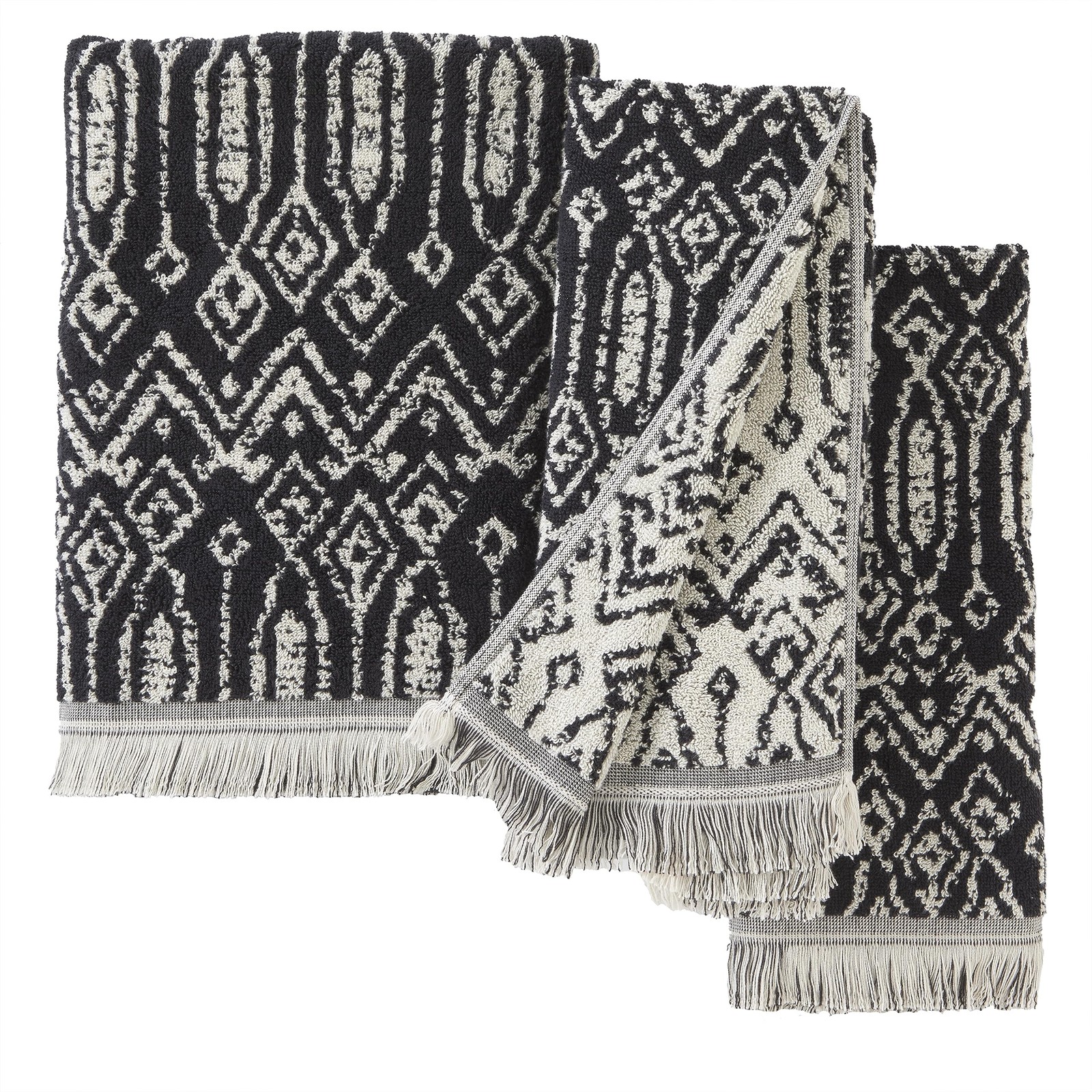 Includes 2 hand towels Plush cotton terry with a unique, 2-tone jacquard pattern and fringed hem Colors in pattern are opposite on reverse side Coordinating bath towels sold separately Certified Standard 100 by OEKO-TEX (free from harmful chemicals)