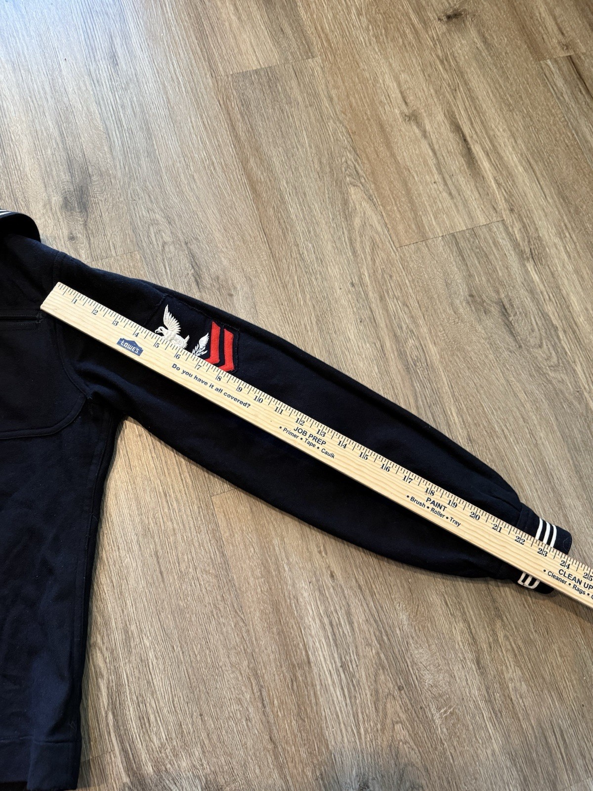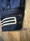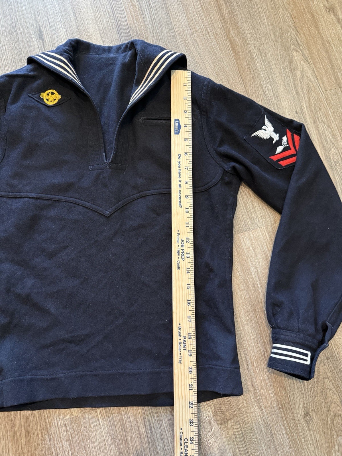 Description (Revised for Clarity) Authentic WWII Naval History – The "Shipmate Trade" Jumper This original WWII US Navy "Crackerjack" dress blue jumper features a fascinating piece of documented history. While the name "Sanders" is written in the collar, the garment is officially stamped with the laundry mark "HAS" and service number "341 01" belonging to Herman Junior Schmalz (1922–2011). The Story & Provenance: This item was sourced directly from the estate of Herman Junior Schmalz, an Aviation Radioman 2nd Class who served aboard the USS Currituck (AV-7) during the Philippines campaign. In the tight quarters of a wartime ship, gear was frequently traded or mixed up in the bulk laundry. Herman clearly "inherited" or traded for this jumper from his shipmate, Sanders, and marked it with his own official service stamp (HAS = Herman August Schmalz). Key Features: Rank: Original Aviation Radioman 2nd Class sleeve patch (Eagle over winged sparks). Identification: Stamped "341 01 HAS" (Herman’s unique Texas-based service number). Ship History: The USS Currituck was a seaplane tender that played a vital role in Pacific operations. Historical Connection: I am currently listing several other items from Herman Schmalz’s estate, including his primary uniform set and additional jumpers. Please check my other listings to see the complete collection. Condition Note: This jumper is in great structural shape for its age. There is one small hole on the back of the left arm (see photos). This is a common "moth nip" on 80-year-old wool and does not detract from its historical display value. The wool remains a deep, rich midnight blue.