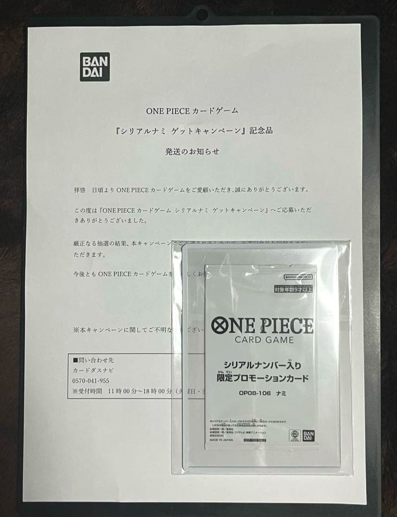 We may be able to offer a slight discount for multiple purchases. If you are interested in buying multiple items, please send us a message in advance with the items you wish to purchase. Additionally, even if the item is not listed, if it's a Japanese product, we can likely source it for you. Feel free to contact us! Description Nami OP08-106 Serial Promo Japanese One Piece Card w/ Certificate Unopened 2025 - Official ONE PIECE Card Game serial-numbered Nami promo card - Obtained through the limited “Get Campaign” lottery in Japan - Includes the original winning certificate (notification letter) - Unopened and preserved in original condition - Highly collectible Japanese promo with serial numbering - Ideal for collectors seeking rare campaign-exclusive items Shipping Our store offers three shipping options: Economy, Standard, and Expedited shipping. You can choose the shipping method that best suits your needs. If you need the item quickly, we recommend selecting Expedited shipping. For Economy shipping, please note that it may take 10-30 days for delivery from the date of shipment. Additionally, Economy shipping may use a shipping method without a tracking number. For Standard and Expedited shipping, tracking numbers will be provided. Shipping is only available to the address registered on eBay. If you wish to ship to a different address, please update your address on eBay before placing the order. Shipping is available Monday to Friday. We do not ship on weekends as shipping carriers are closed. We do not declare the value of merchandise as lower or mark items as ?gifts?. This is prohibited by the government regulations of Japan, the United States, and other countries. If your shipping address is in an area designated as remote by the shipping carrier, you will need to pay additional shipping fees via PayPal. About Importer's Obligation Import duties, taxes, and charges are not included in the item price or shipping cost. These charges are the buyer's responsibility. Please check with your country's customs office to determine what these additional costs will be prior to bidding or buying. Thank you for your understanding.