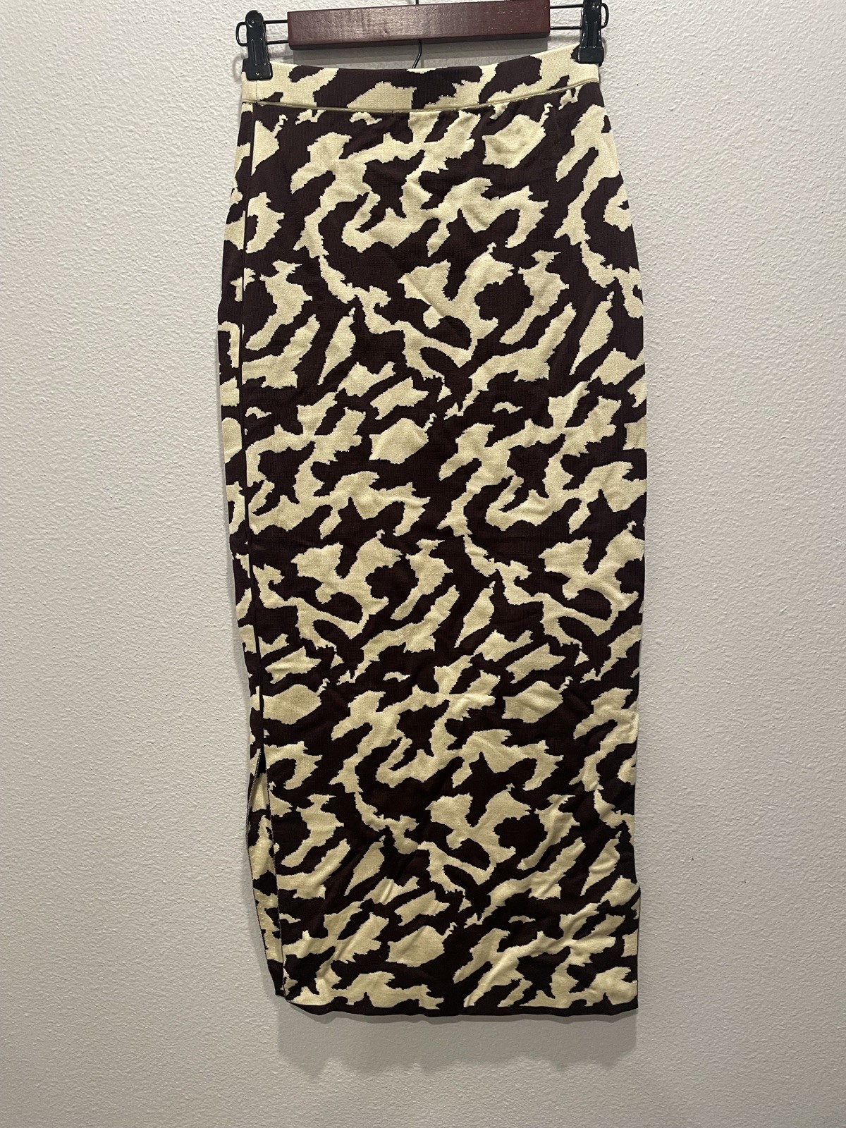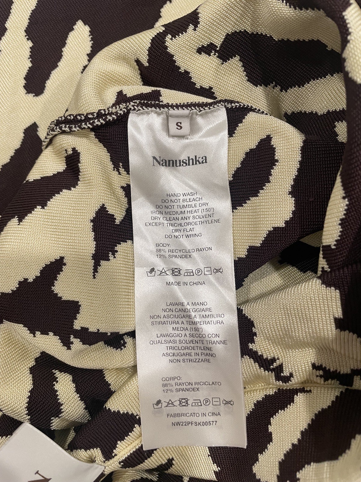 The Nanushka Women's Brown Jenny Bodycon Midi Skirt in size S is a versatile and stylish piece perfect for various occasions. Made from a blend of spandex and rayon, this skirt features a striking animal print pattern in brown, adding a touch of art and creativity to your wardrobe. With a pull-on closure and elastic waist, it offers a comfortable fit that is both stretchy and flattering. The double slit detail adds a unique flair to the bodycon style, making it a standout piece for any season. See pictures for quality and measurements.