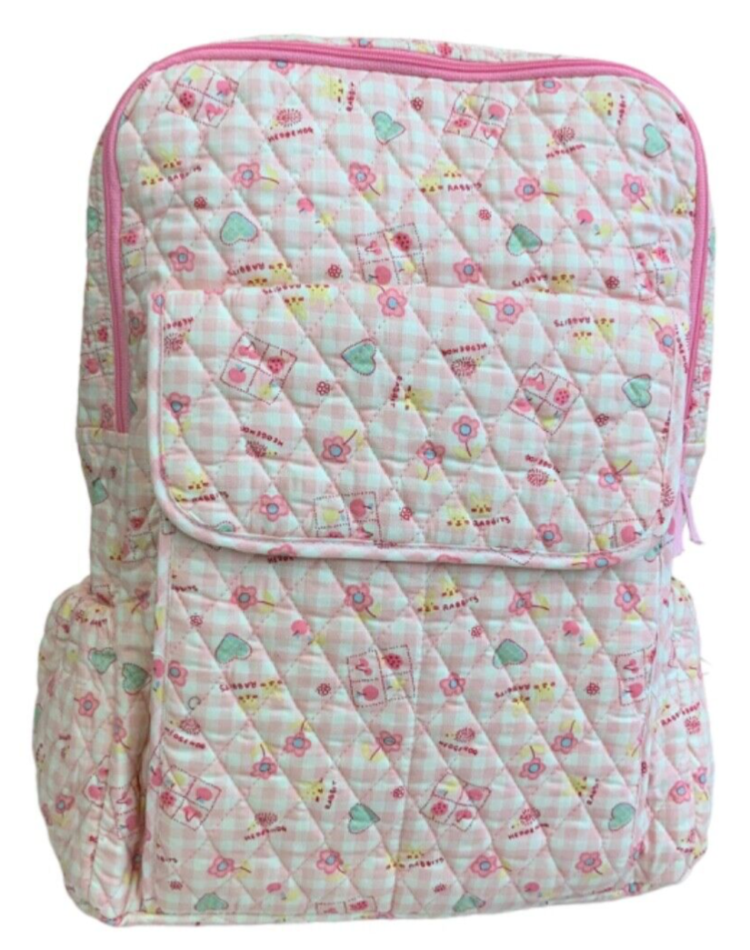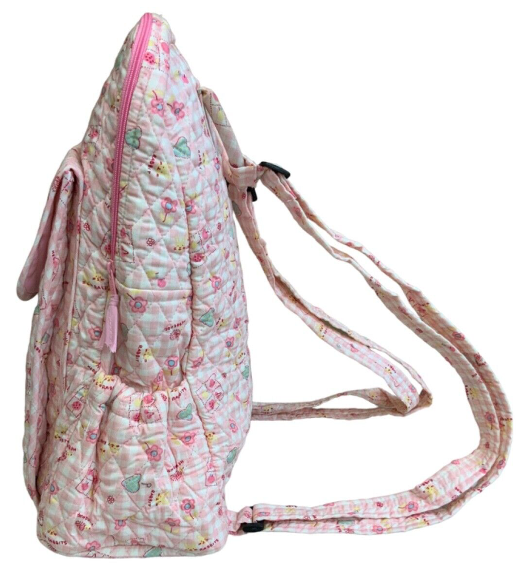 Naples Bag Co. Floral and Animals Quilted Backpack Approx 14 inches long Approx 5 inches wide Approx 15 inches high Handle approx 3 inches high Back straps approx 25 inches long Back straps approx 17 inches short Backpack has a floral with animals pattern. The front has two magnetic snaps that opens to two long pockets and a medium pocket. Each side has a stretchy elastic little pocket. Main part of backpack opens with a single zipper. Inside there’s a pink checkered pattern. Also inside has a little open pocket with a little zipper pocket on it and the pattern match’s the outer pattern of the Backpack. The back has two adjustable back straps that you can adjust to how long or short you want the backpack to hang from your shoulders. On top of the backpack is a little handle to make it easier to pick up or move around.