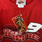 This vintage Winners Circle t-shirt features a bold graphic of Kahne in his 1995 NASCAR Sprint Cup Series car. The shirt is made of comfortable cotton and cotton blend material, with a solid pattern in a vibrant red color. The shirt's neckline is a classic crew neckline, and it has short sleeves, making it a perfect choice for summer, fall, or spring. The shirt is available in a size L, and it is a regular fit for men. The Y2K and 90s racing and sports theme makes this t-shirt a must-have for any NASCAR fan or collector. Get your hands on this iconic piece of memorabilia from the Winners Circle brand today.