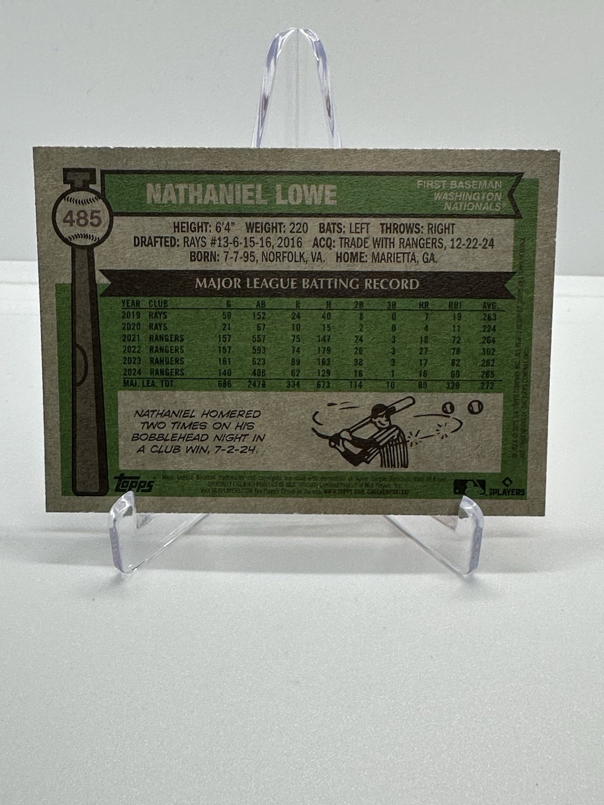 The product is a 2025 Topps Heritage #485 baseball trading card featuring Nathaniel Lowe of the Washington Nationals. This specific card is a SP Red Border parallel, adding a unique collectible element to the set. As a non-autographed rookie card in near mint condition, it appeals to fans and collectors looking for a standout addition to their baseball card collection. With its limited availability and distinct featured design, this card is sure to be a coveted item for any MLB enthusiast.