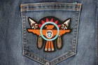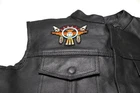 4x3.2 inch. Embroidered Patch with Plastic Iron on Backing. Patch can be sewn on to Leather Vests, Jackets or Chaps. Patch can also be ironed on to Denim Shirts, Hats or Bags. Iron on Patch at 280 Degrees Fahrenheit for 30 Seconds. Ironing on Application is a semi permanent way of attaching patches. Sew on the Patch for Permanent application. Do not iron on patches to Leather or Nylon Materials.