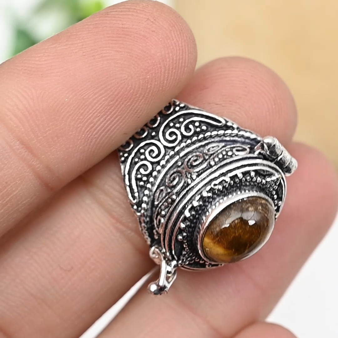 Natural Adjustable Tiger Eye Gemstone Pill Box Ring in 925 Sterling Silver