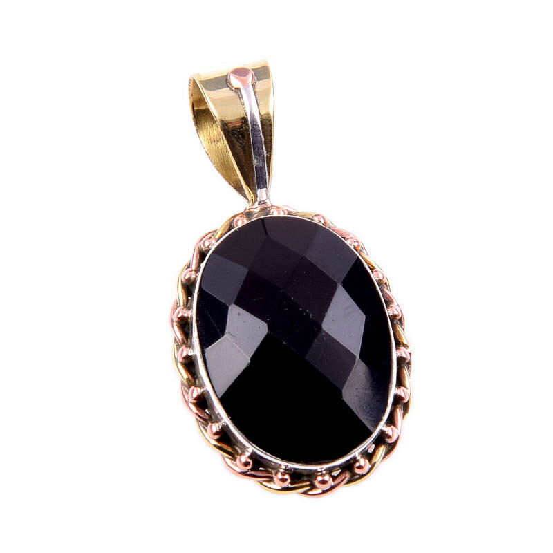 Natural Black Onyx Gemstone 925 Solid Sterling Silver TwoTone Pendant 1.25"