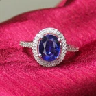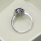 The item arrived safely. It is as described. The main stone has a pretty, lightly blue-ish purple hue. The side three stones too are ever-so-slightly lavender tinted. So lovely. One of the photos has the ring stacked with a clear white moissanite ring and a tanzanite eternity ring to show the color comparison/adjustment.