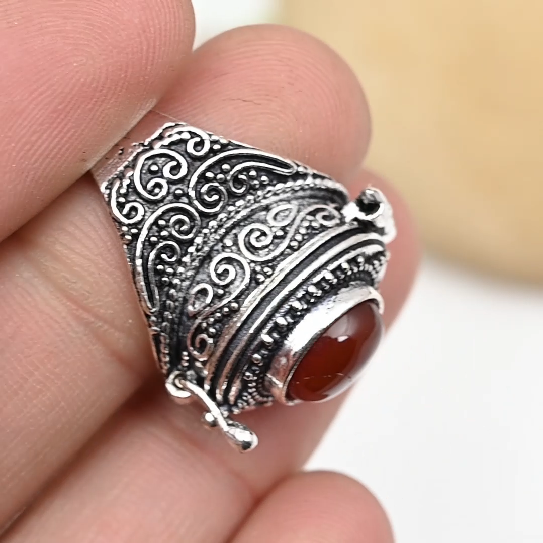 Natural Carnelian Gemstone 925 Sterling Silver Adjustable Pill Box Ring