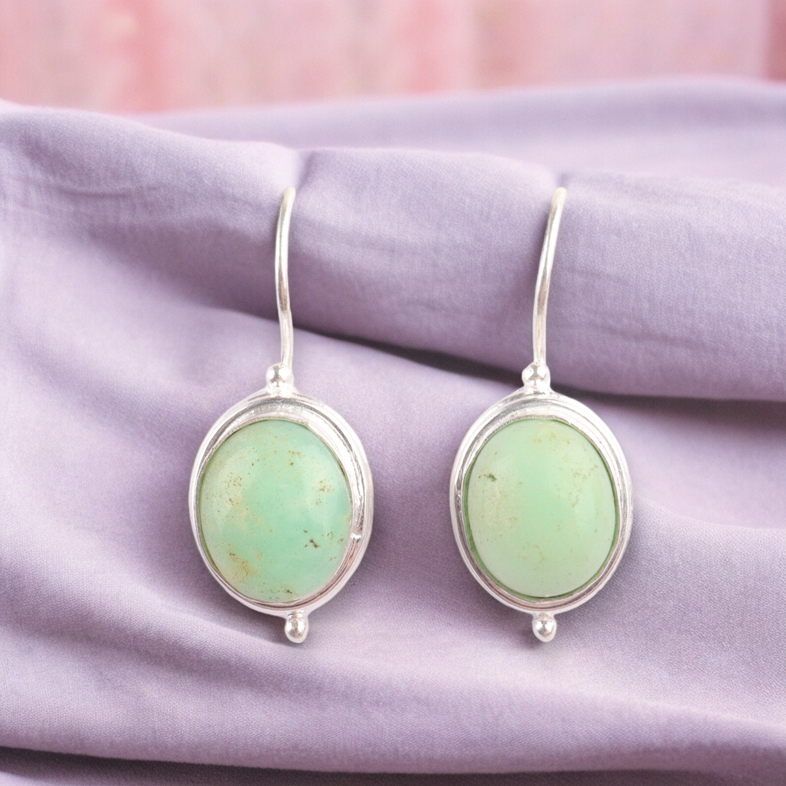Welcome to Jaipur Silver Gallery Natural Crysoprase Gemstone Drop/Dangle Minimalist Earrings 925 Silver For Women Handmade Earrings, Sterling Silver Earrings, Crysoprase Earrings, Handcrafted Earrings SKU : - JSEE-115-31 Gemstone : - Crysoprase Stone Shape : - Oval Metal : - Sterling Silver Metal Purity : - 925 Earring Length : 1.24 Inches Earring Width : Inches _______________________________________________________________________________________ Amazing Properties of Silver ****************************** Tough and Long-lasting: Silver is incredibly strong, built to withstand daily wear and tear as well as tough environmental conditions. Easy to Shape and Design: Silver is like clay for skilled craftsmen, allowing them to create beautiful and intricate designs effortlessly. Great at Conducting Energy: When it comes to heat and electricity, silver is the go-to. It can quickly and efficiently transfer energy, making it ideal for various applications. Keeps Things Clean and Safe: Silver has a natural ability to keep harmful bacteria at bay, making it a reliable choice for promoting cleanliness and well-being. 3 Underrated Benefits Of Silver ****************************** Gorgeous Charm: Silver jewelry shines brightly, enhancing any outfit and fitting everyone's style with ease. Gentle on Skin: Silver is kind to your skin, reducing the chance of allergies and making it a favorite choice for accessories. Healing Vibes: Some believe silver jewelry has a soothing touch, possibly aiding in easing issues like arthritis, anxiety, and the blues. _______________________________________________________________________________________ For Mother's Day Gift For Father's Day Gift For Promise For Valentine' Day For Halloween Party For Christmas Day Gift For New Year Party For Mom For Her _______________________________________________________________________________________ If you need more help or want design tips, just give us a shout! We're lightning-fast in getting back to you. Every single thing we create is made by hand in our special workshop, and we put a whole lot of love and care into every piece. Thank you for stopping by! We're confident you'll have an amazing time shopping with us. We're here to make sure every moment you spend with us is filled with delight and satisfaction. Happy shopping!