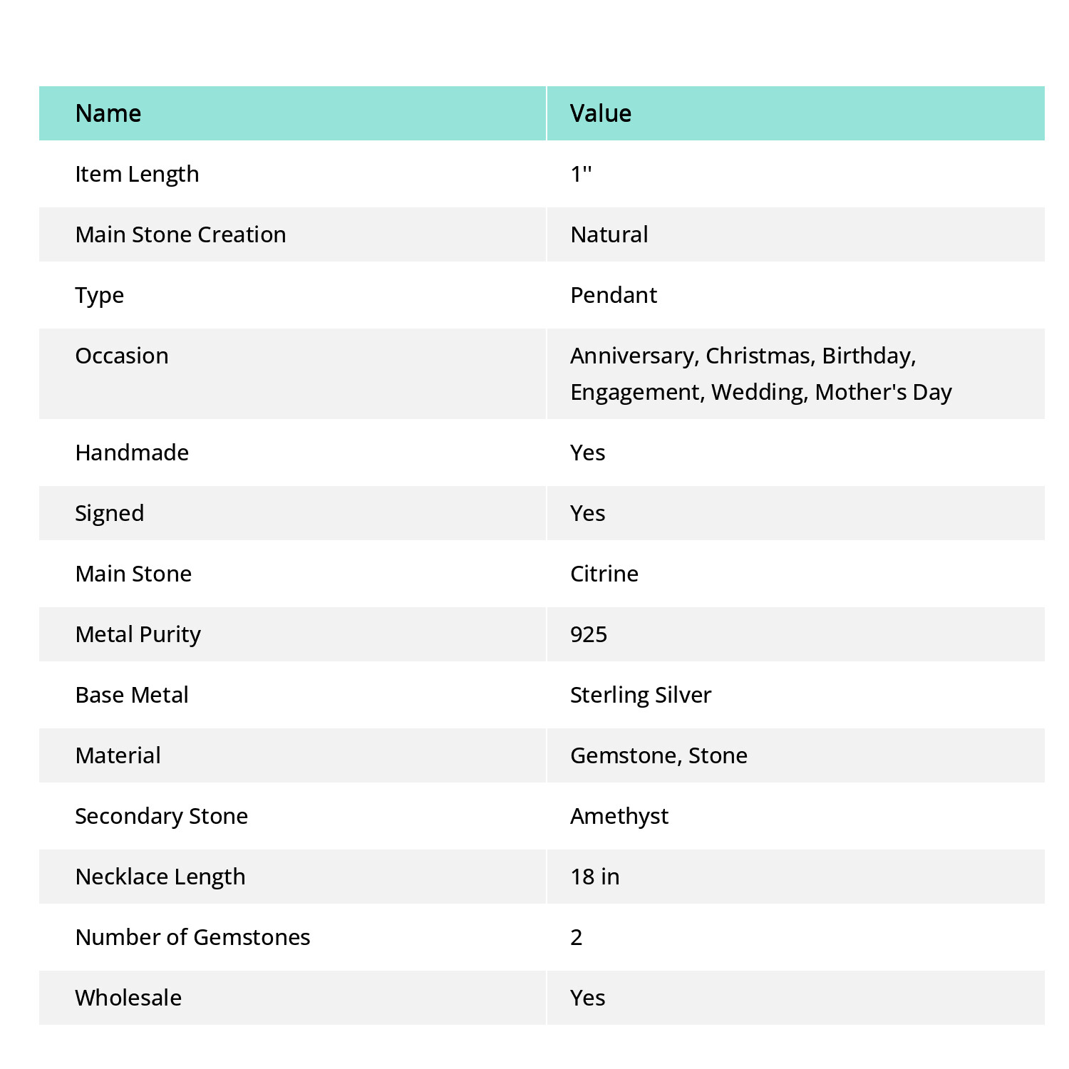 Type: Pendant Main Stone: Citrine Setting Style: Channel-Set Chain Type: Rolo UPC: does not apply Main Stone Shape: Same As Picture Occasion: Anniversary, Christmas, Birthday, Engagement, Wedding, Mother's Day Cut Grade: Fair Diamond Color Grade: Not Applicable Theme: Art, Beach, Family & Friends Secondary Stone: Amethyst Era: Undated Metal Purity: 925 Colored Diamond Intensity: Not Applicable Brand: Unbranded Color: Yellow Number of Diamonds: 0 Certification: Yes Features: Adjustable, Engraved Material: Gemstone, Stone Closure: Toggle Number of Gemstones: 2 Diamond Clarity Grade: Not Applicable Handmade: Yes Main Stone Color: Yellow Country/Region of Manufacture: India Collection: Brand New Item Length: 1'' Main Stone Treatment: Not Enhanced Customized: No Main Stone Creation: Natural Style: Cluster Base Metal: Sterling Silver Necklace Length: 18 in gtin13: does not apply Country of Origin: India Wholesale: Yes Signed: Yes Weight: 2.2 gm Pendant/Locket Type: Charm Pendant Shape: Same As Picture Metal: Sterling Silver Total Carat Weight: 50 Carat Above ProductName: Pendant Gemstone Clarity Grade: Eye Clean