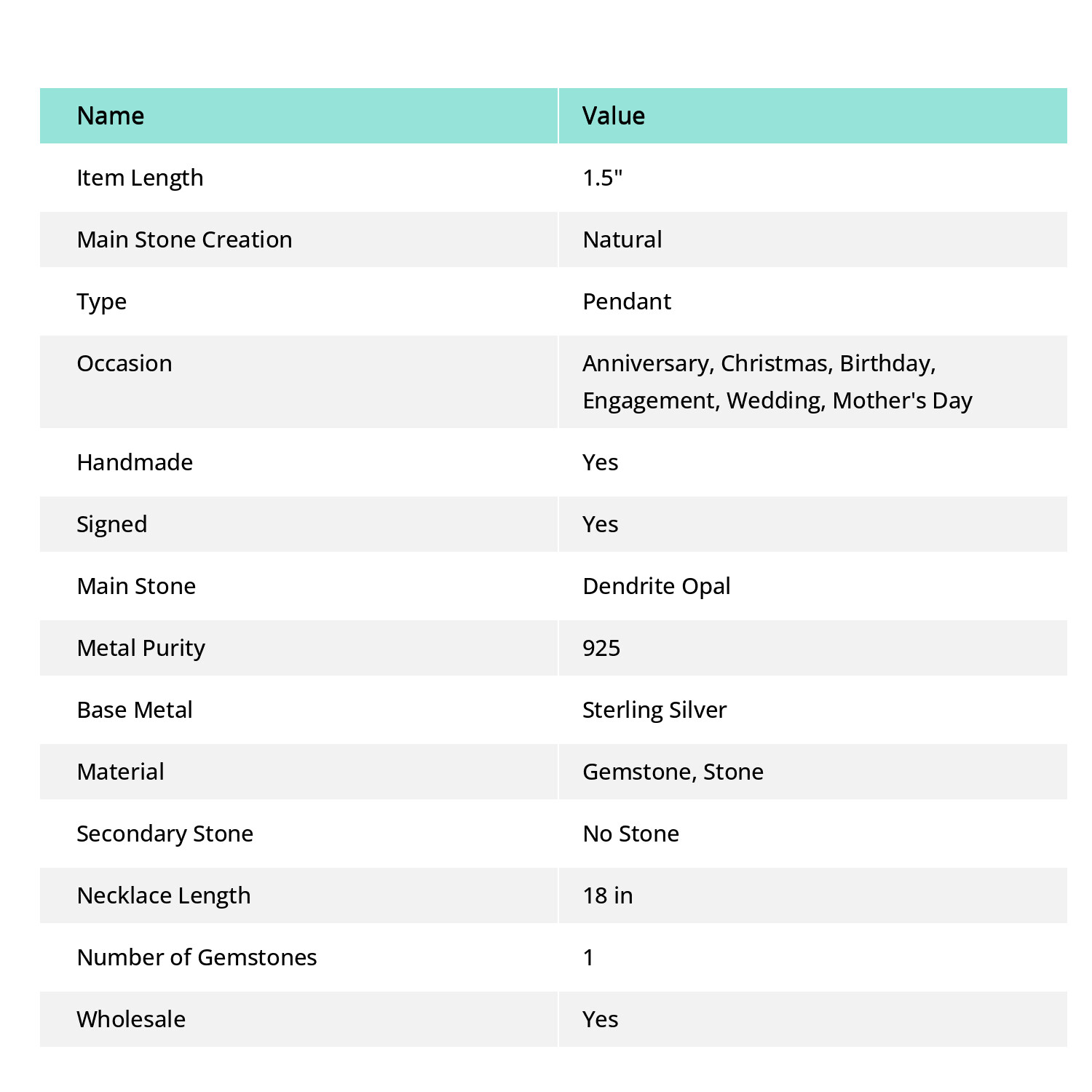 Handmade: Yes Secondary Stone: No Stone Cut Grade: Fair Customized: No Color: White Number of Diamonds: 0 Necklace Length: 18 in Theme: Art, Beach, Family & Friends Country of Origin: India Base Metal: Sterling Silver Colored Diamond Intensity: Not Applicable Signed: Yes Pendant/Locket Type: Charm Item Length: 1.5" Metal: Sterling Silver Main Stone Creation: Natural Brand: Unbranded Country/Region of Manufacture: India Stone-Size: 14X24mm Features: Adjustable, Engraved Wholesale: Yes UPC: does not apply Collection: Brand New ProductName: Pendant Material: Gemstone, Stone Metal Purity: 925 Type: Pendant Diamond Color Grade: Not Applicable Chain Type: Rolo Main Stone Treatment: Not Enhanced gtin13: does not apply Era: Undated Main Stone Size: 14X24mm Weight: 5.8 gm Gemstone Clarity Grade: Eye Clean Diamond Clarity Grade: Not Applicable Main Stone Color: White Occasion: Anniversary, Christmas, Birthday, Engagement, Wedding, Mother's Day Pendant Shape: Same As Picture Number of Gemstones: 1 Style: Chain Total Carat Weight: 50 Carat Above Main Stone Shape: Same As Picture Setting Style: Channel-Set Closure: Toggle Certification: Yes Main Stone: Dendrite Opal