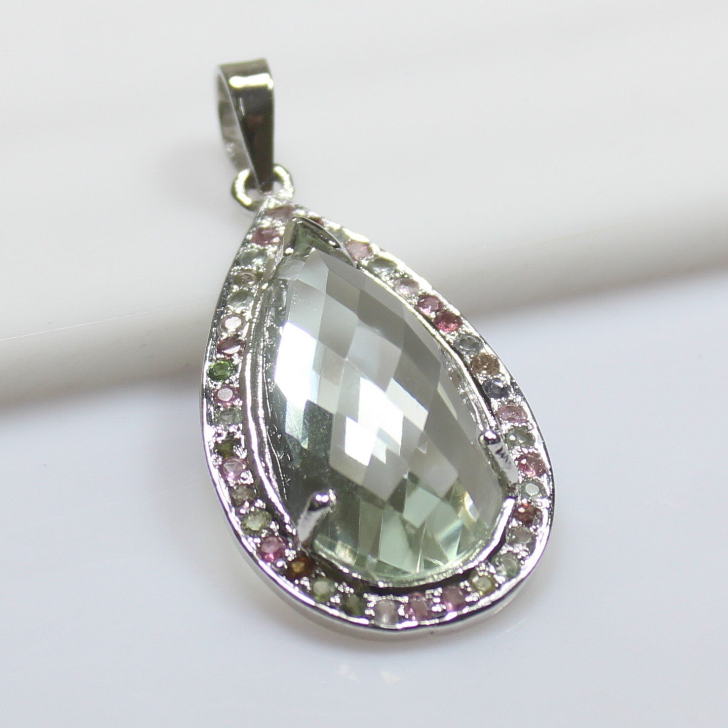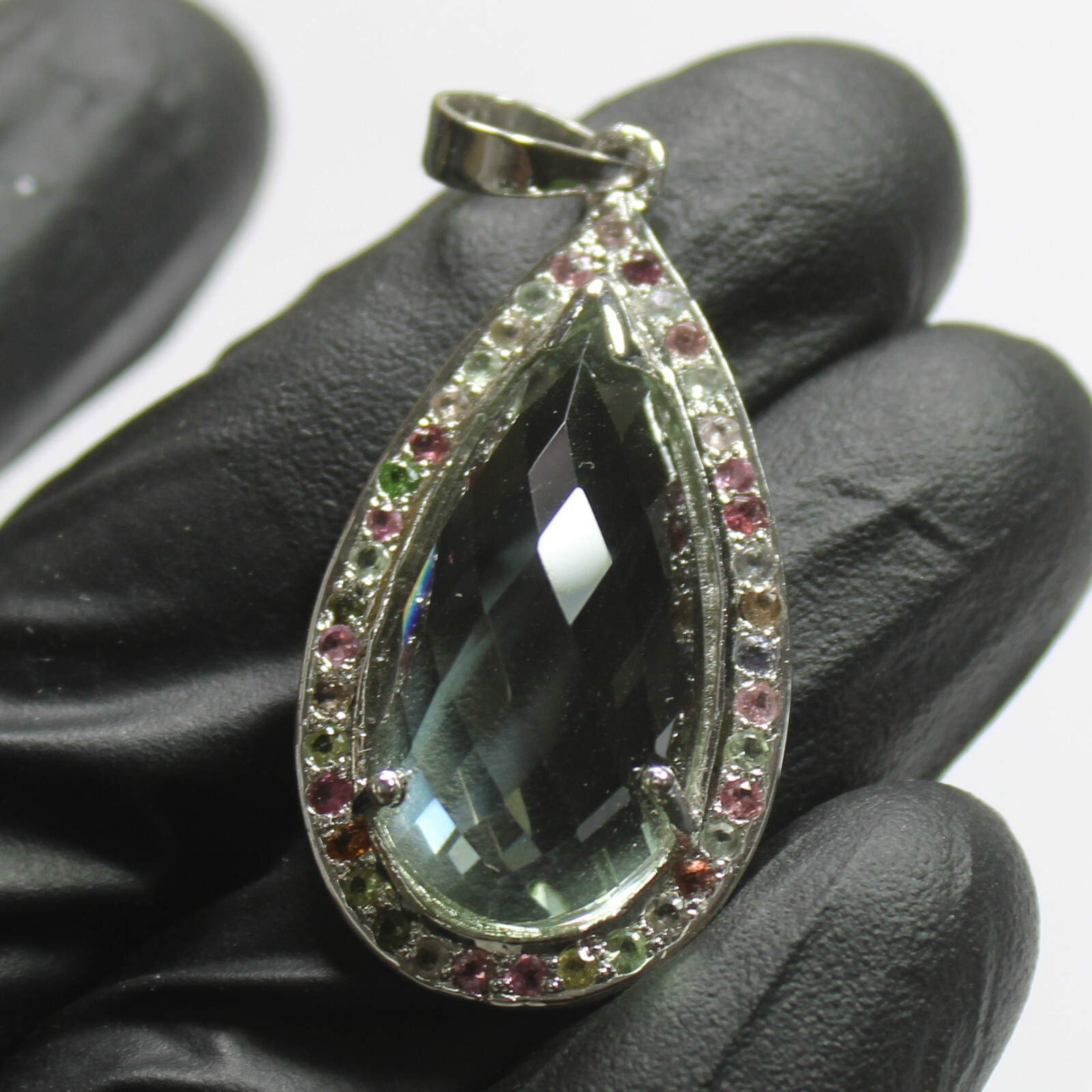 ARBIYA GEMS JEWELRY TYPE : SILVER PENDENT STONE : NATURAL GREEN AMETHYST SIDE STONES : MULTI TOURMALINE PENDENT SIZE : 1 INCH PENDENT WEIGHT : 7.27 GRAMS PENDENT METAL : STERLING SILVER METAL PURITY : 925 TREATMENT : NATURAL COUNTRY OF ORIGIN : INDIA HANDLING TIME: 1-2 DAYS DELIVERY TIME : WE USUALLY TAKES 15-25 DAYS BUT MOSTLY IT DELIVERS TO CUSTOMERS WITHIN 15 DAYS RETURN POLICY : RETURN ACCEPTED ON MANUFACTURING DEFECT WITHIN 30 DAYS . RETURN GIVEN AS MONEY BACK OR REPLACMENT FEEDBACK POLICY : PLEASE LEAVE US A POSITIVE FEEDBACK IF YOUR ITEMS DELIEVERED IN GOOD CONDITION